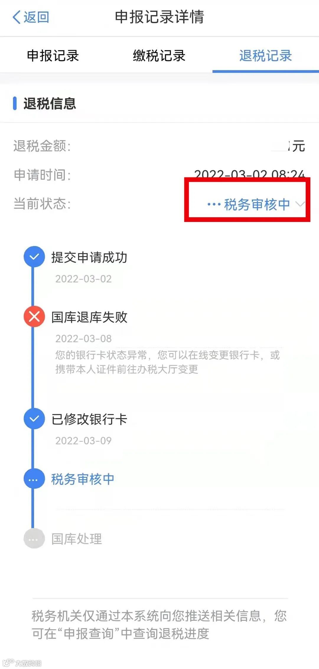 如果退税记录显示“国库退库失败”,请关注你申请退税的银行账户是否为本人账户,该账户是否处于注销、挂失、冻结、未激活、收支有限额等状态。如果遇到该种情况,需点击【修改银行卡】重新填报你本人符合条件的银行账户。
