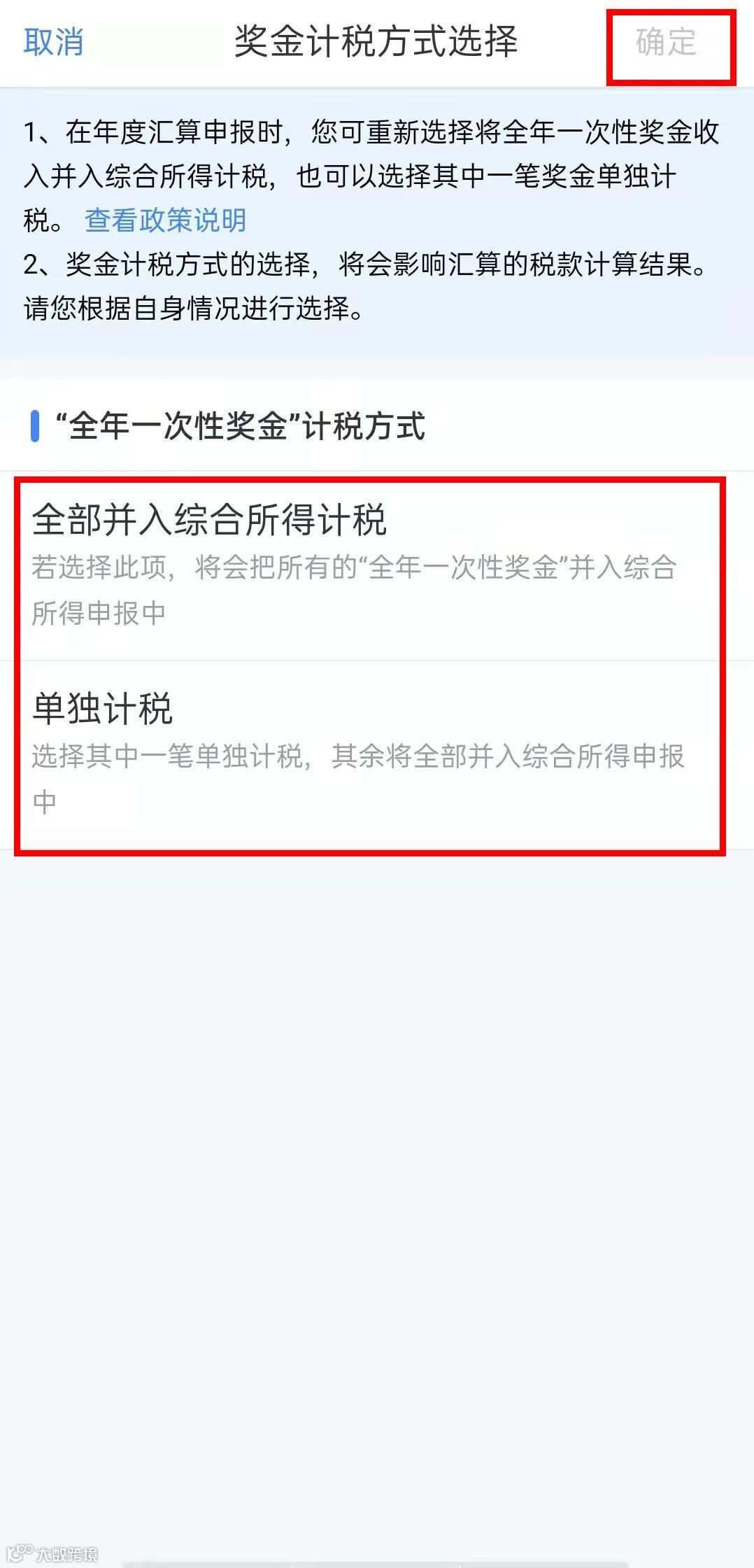 如果您存在全年一次性奖金收入,可以点击“存在奖金,请在详情中进行确认”。选择单独计税,或者全部并入综合所得,点击【确定】。