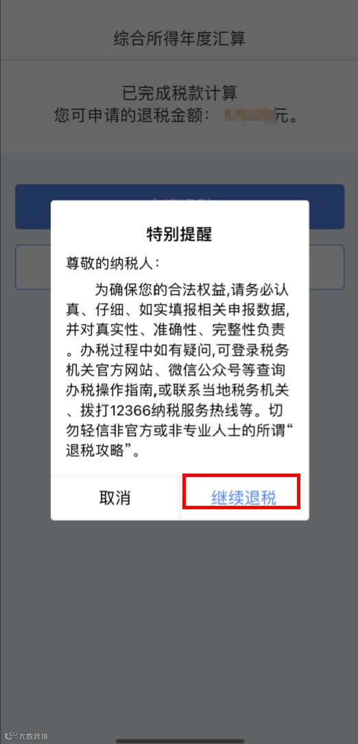 点击“申请退税”后,系统会弹出特别提醒,阅读以后点击“继续退税”