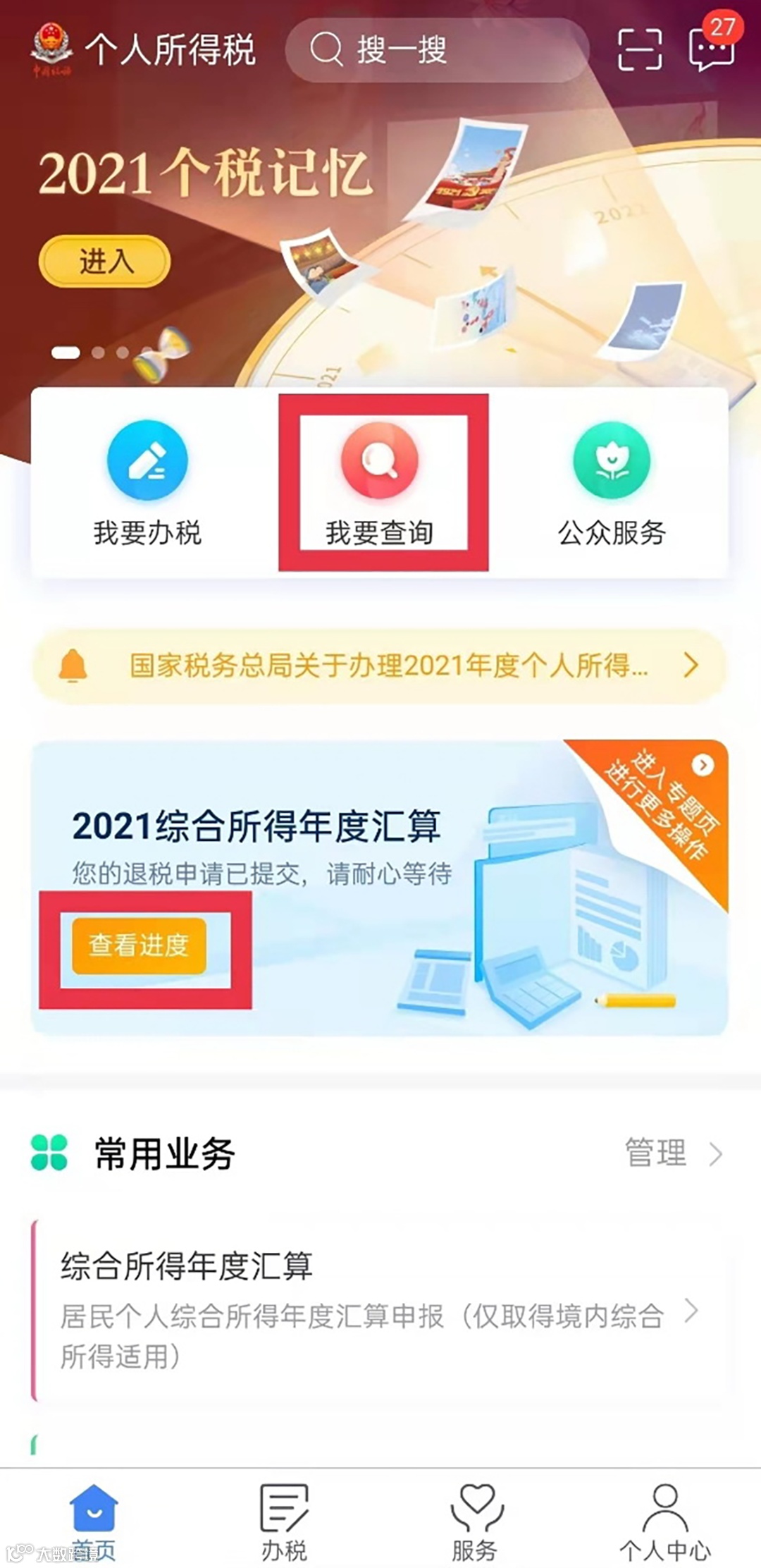 您可随时通过APP首页进入“2021综合所得年度汇算”专题页查看进度,或点击【我要查询】-【申报查询】-【已完成】,点击“2021年度综合所得年度汇算”-“退税记录”,查看退税进度。
