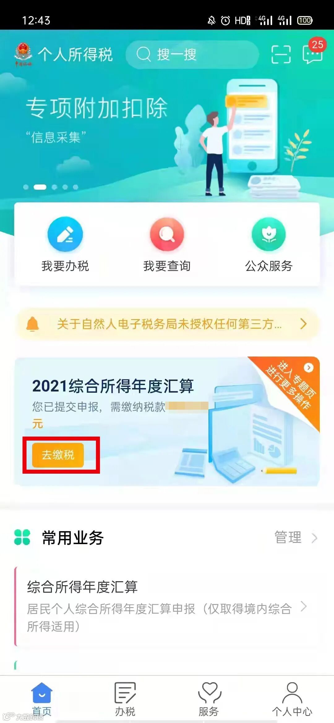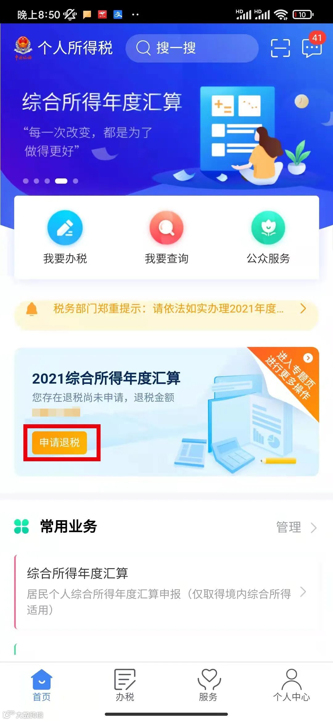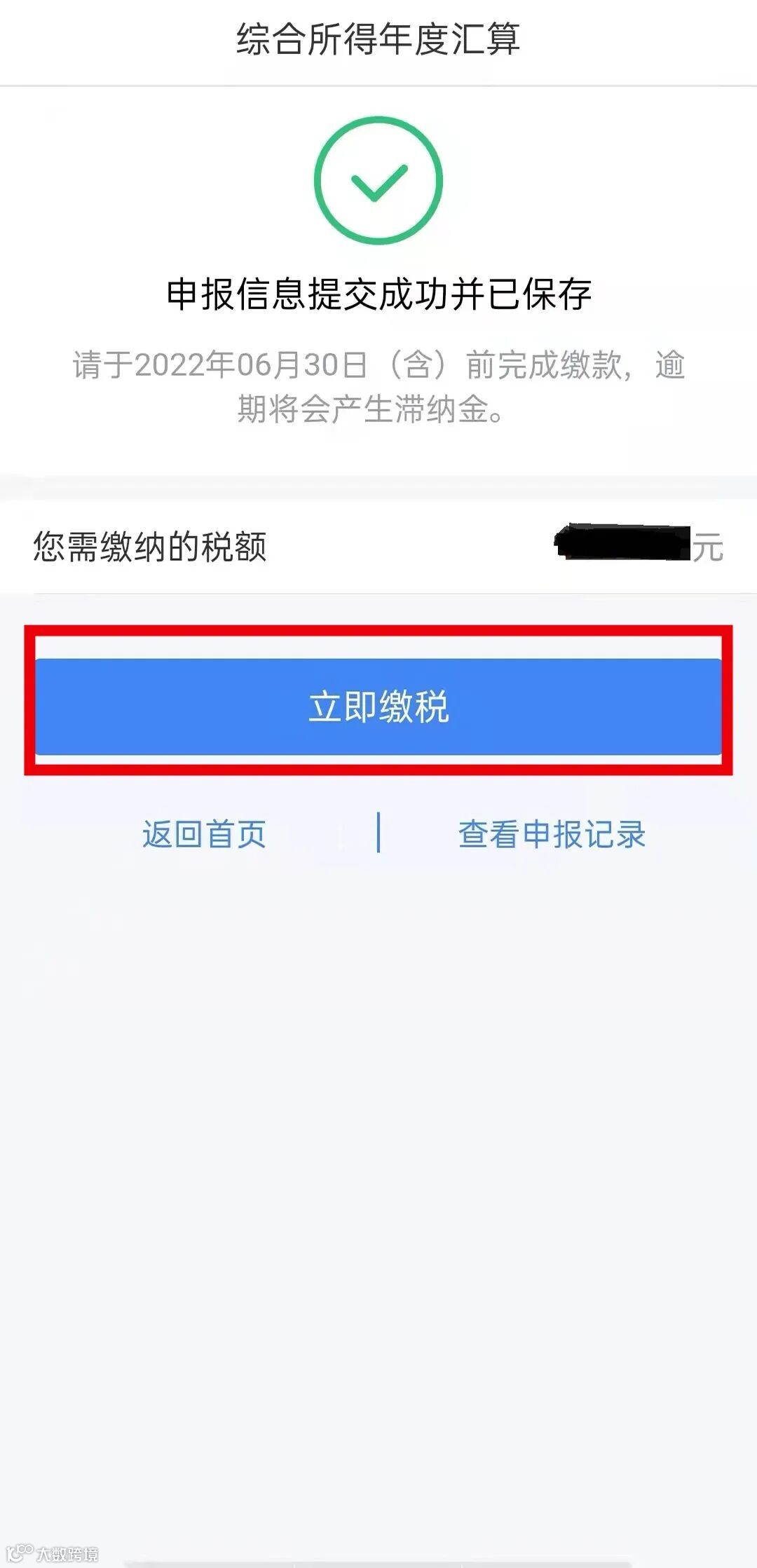 申报后,请您注意APP首页“2021综合所得年度汇算”专题页提示,如果显示【去缴税】、【申请退税】,请点击并按系统提示完成缴税或退税。
