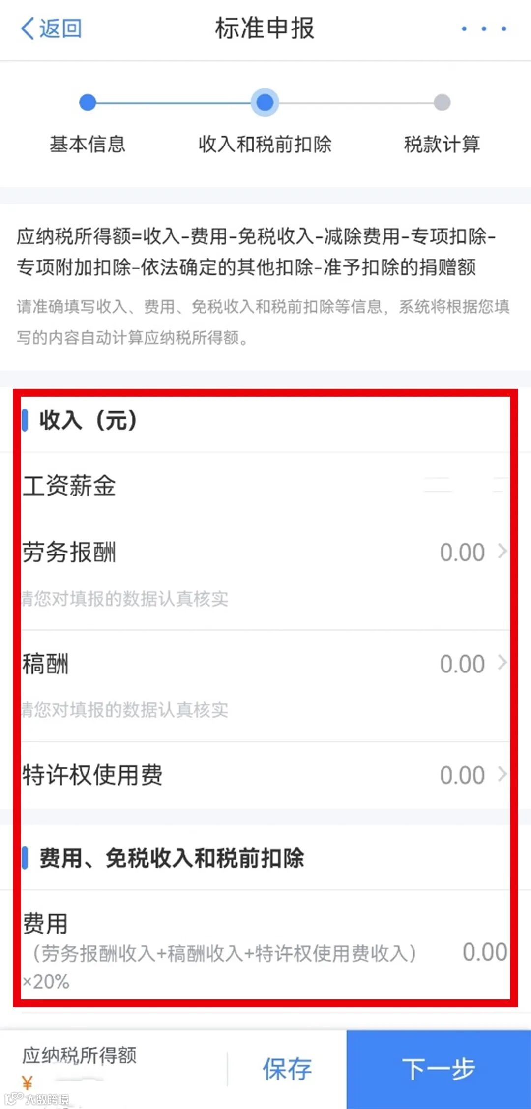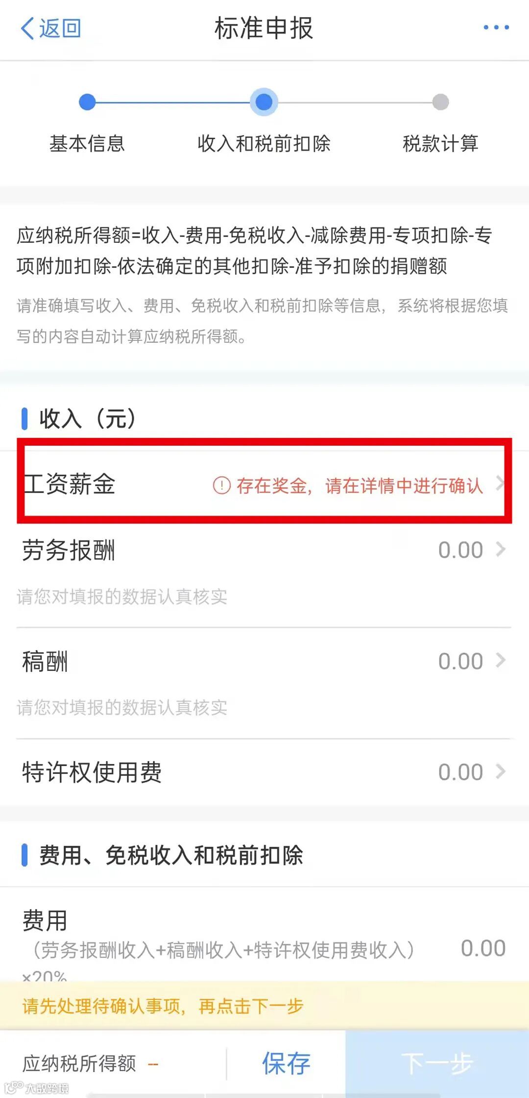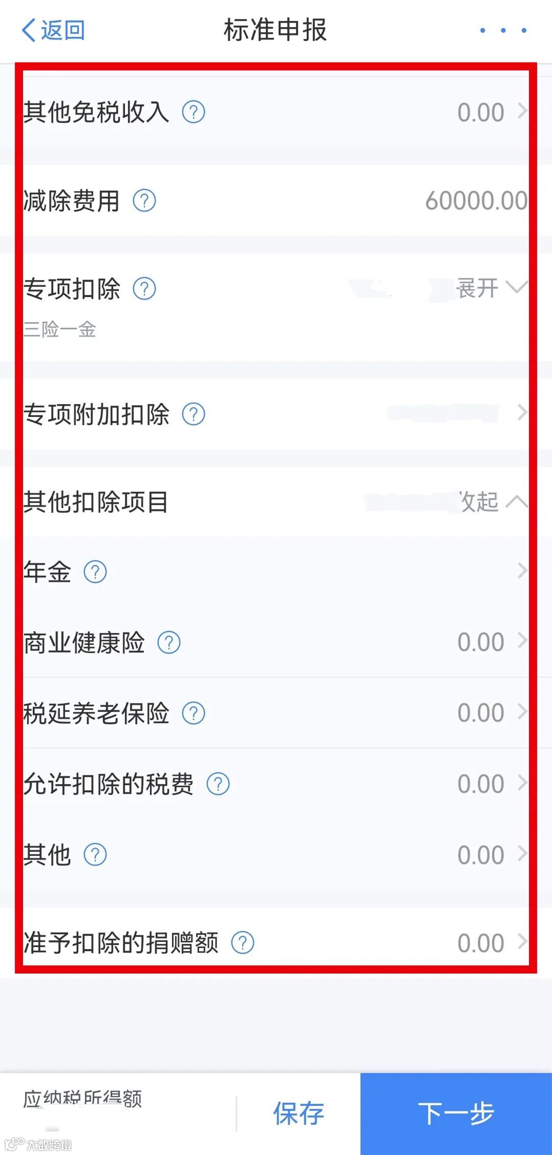 在标准申报主页面依次核对收入、免税收入和税前扣除等信息,点击任一项数据,可以查看您的明细数据,并在相应页面【新增】数据 。