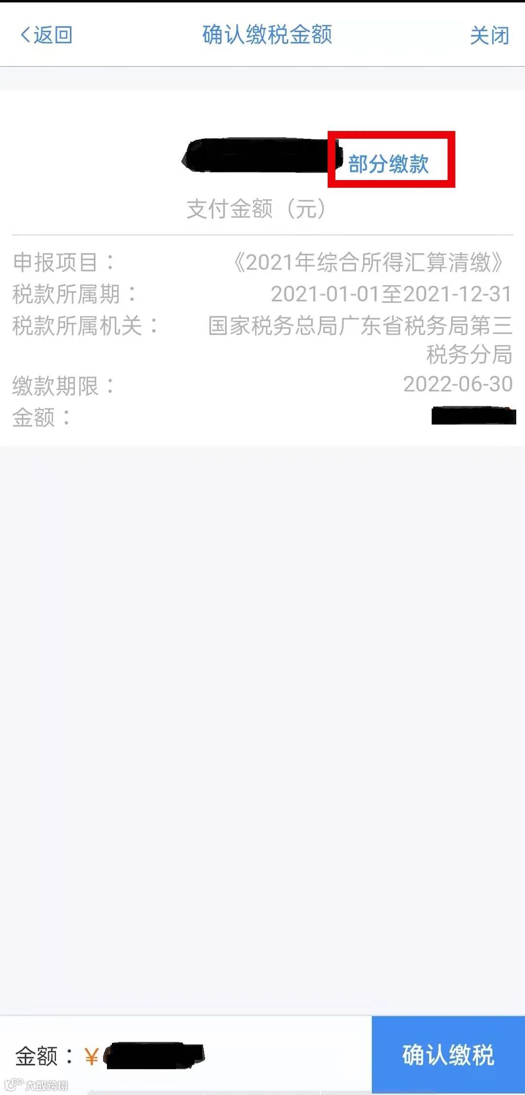 (2)如存在应补税额,点击【提交申报】。在确认缴税金额页面点击【确认缴税】,或者点击【部分缴税】——输入缴税金额——点击【确定】。