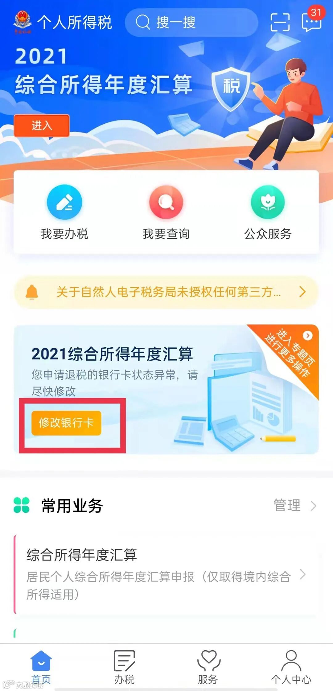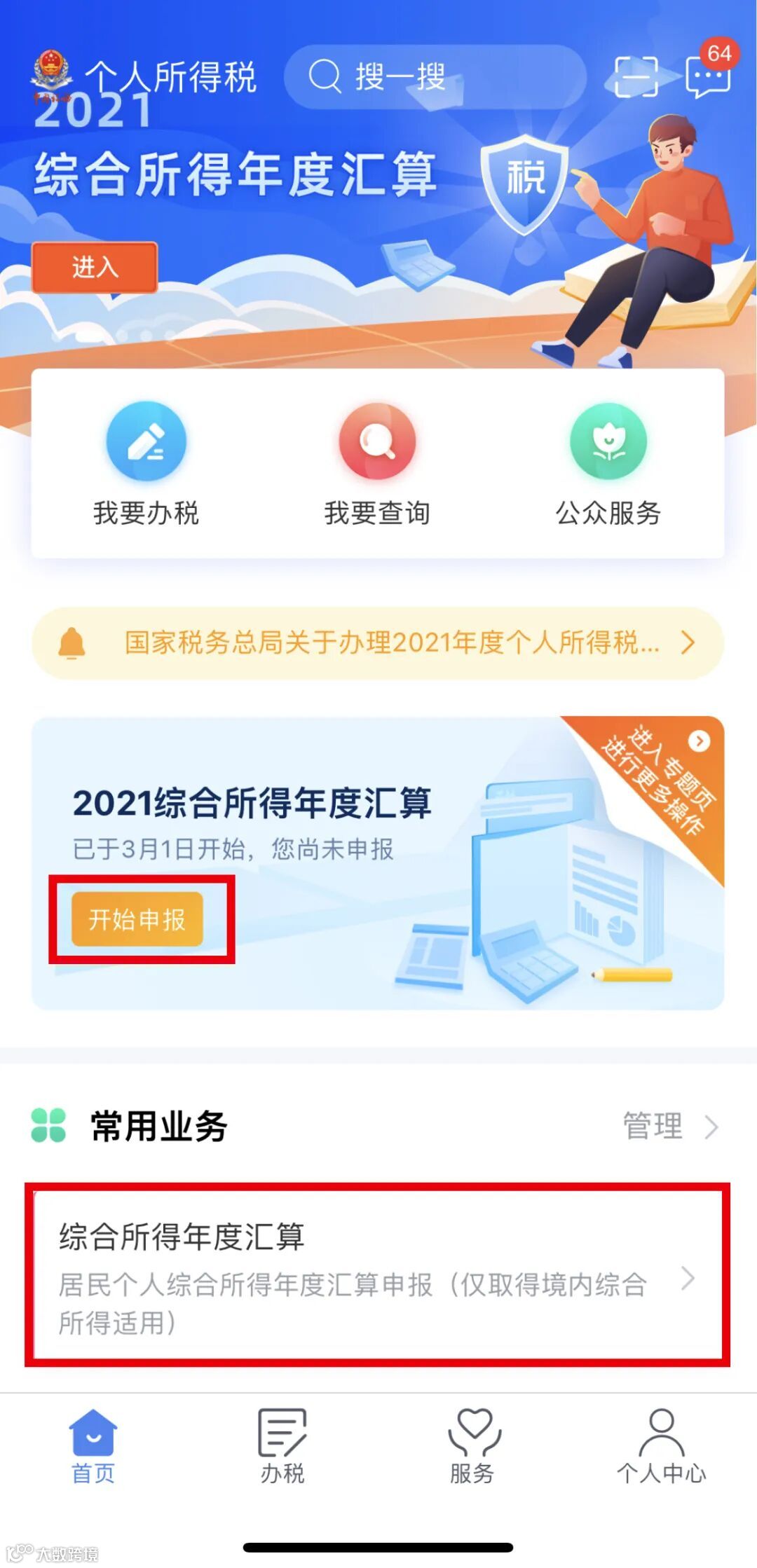 首页点击“2021综合所得年度汇算”【开始申报】,或点击“常用业务”【综合所得年度汇算】。