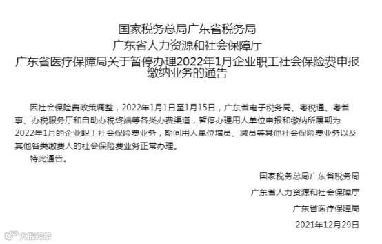 关于暂停办理2022年1月企业职工社会保险费申报缴纳业务的通告