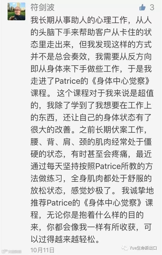 我个人强烈推荐Patrice的工作坊,如果你在经历身体上任何的不适感。她是一个令人难以置信的杰出的身体工作专家,对我们非常有帮助。