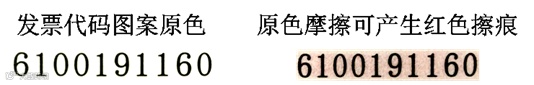 发票各联次左上方的发票代码使用防伪油墨印制,油墨印记在外力摩擦作用下可以发生颜色变化,产生红色擦痕(如下图所示)。