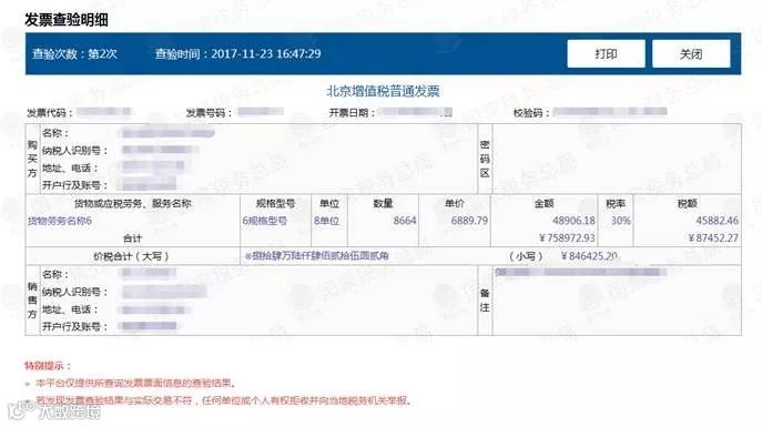 (6)本平台仅提供所查询发票票面信息的查验结果。如对查验结果有疑议,请持发票原件至当地税务机关进行鉴定。