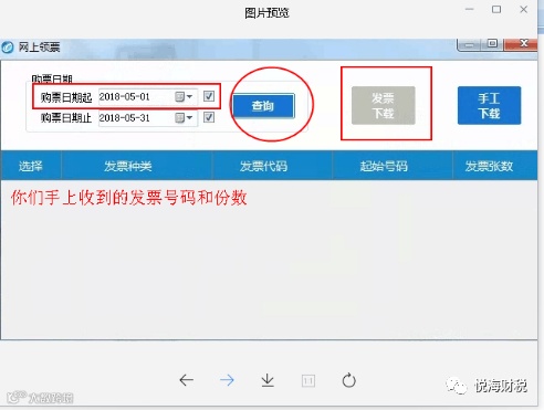点击发票领用后,在新打开的界面,将 购票日期 尽可能往前选,然后点击查询,就会显示收到的发票号码和份数,点击发票下载就可以
