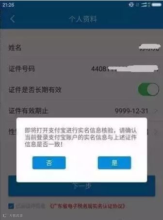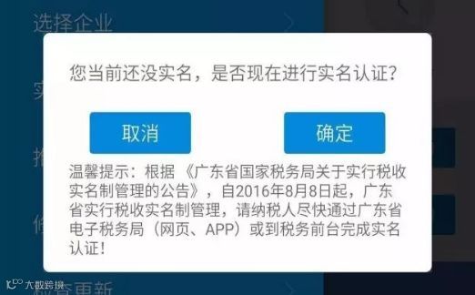 1.登录“广东国税”APP后,系统会自动提示“是否进行实名认证”,点击“确认”(或“是”)