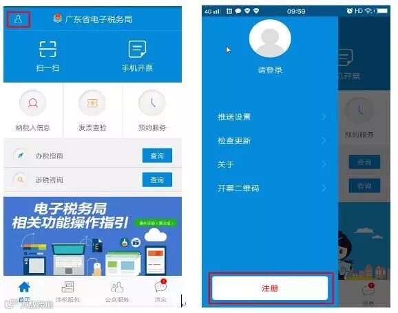 在手机上打开“广东国税”app,点左上角图标,点击“注册”进入注册页面。