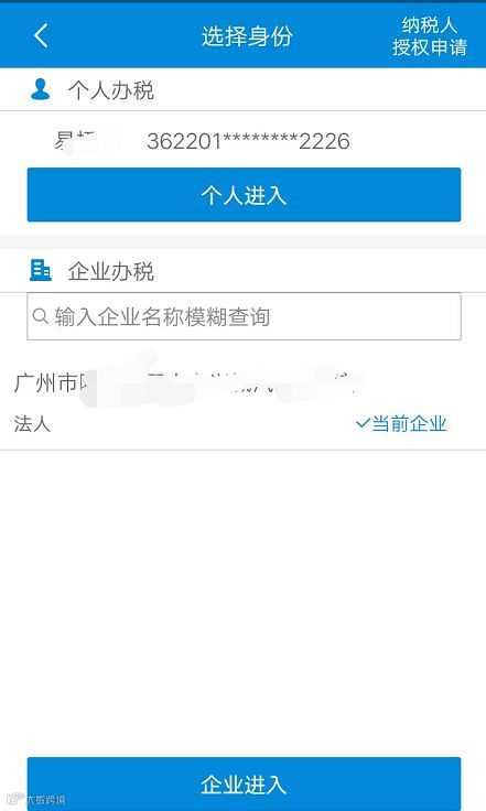 2、若没有您的企业名称。则需要从“选择身份”右上角的“纳税人授权申请”输入需要绑定的公司社会信用代码/纳税识别号进行绑定即可。