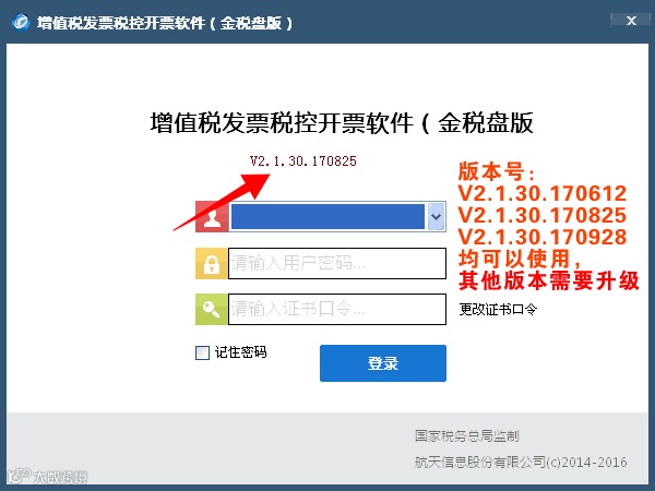 升级完成后,提示开票软件登录界面,界面中有最新版本。