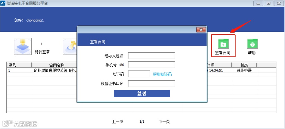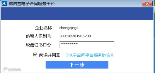 安装成功后进入认证界面,用户输入正确的税盘证书口令后,进入合同签署页面。
