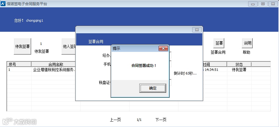 如下图提示合同签署成功,点击【确定】即完成税控服务协议在线签署。
