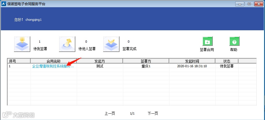 进入到主界面,点击【待我签署】按钮,如下图,在列表中将出现待签署合同;