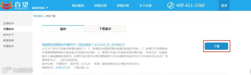 2.点击【软件下载】,选择【税控开票软件(税控盘版)V2.0.24 180625】