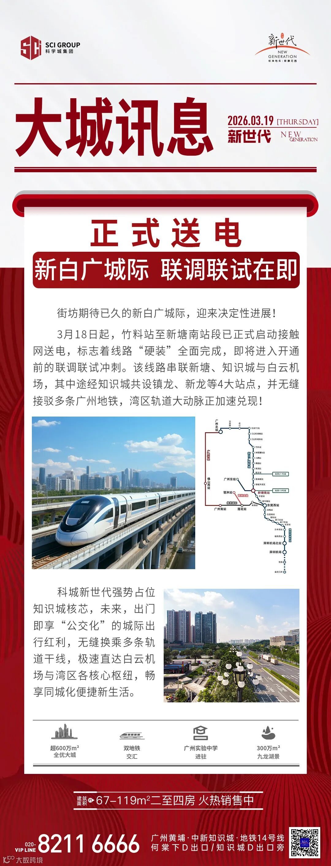 免责声明:1、本广告内容仅为要约邀请,所涉及的图文及数据等相关内容仅供参考,不构成开发商承诺的任何交付标准,买卖双方的权利义务最终以双方签订的合同为准;资料中涉及的项目周边环境景观、公建配套、道路交通、商业业态、文化教育及其他市政设施信息,均采集自截至本资料制作之日政府官方媒体及相关网站的公开信息,其中九龙湖控规已取消金融塔,其他具体规划、学位安排等均以规划部门及相关政府部门最终批复及实际建设为准。本宣传资料旨在提供项目景观视野参考,未来相关部门对规划用地的实际建设存在不确定性,视野可能会受到一定遮挡,本资料不视为对视野做出承诺。开发商在法律法规允许的范围内保留随时对本资料修改的权利及最终解释权,敬请留意最新资料。2、本宣传资料对周边环境、政府规划、商业配套、教育配套、交通、商业设施开办等的介绍仅为提供相关信息,具体以政府最终批文为准,开发商不对此作任何承诺。实际入学政策以及学校招生范围方式等均以政府教育部门发布为准。开发商:广州科城何棠置业发展有限公司,推广案名:科城·新世代,首期地块标准地名:新灏花园,穗房预(网)字第20240307号/穗房预(网)字第20240308号/穗房预(网)字第20240309号,穗房预(网)字第20240383号/穗房预(网)字第20240384号/穗房预(网)字第20240385号;制作日期2026年3月。