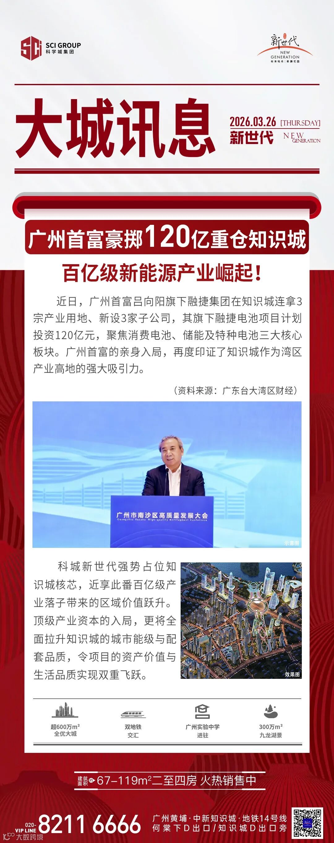 免责声明:1、本广告内容仅为要约邀请,所涉及的图文及数据等相关内容仅供参考,不构成开发商承诺的任何交付标准,买卖双方的权利义务最终以双方签订的合同为准;资料中涉及的项目周边环境景观、公建配套、道路交通、商业业态、文化教育及其他市政设施信息,均采集自截至本资料制作之日政府官方媒体及相关网站的公开信息,其中九龙湖控规已取消金融塔,其他具体规划、学位安排等均以规划部门及相关政府部门最终批复及实际建设为准。本宣传资料旨在提供项目景观视野参考,未来相关部门对规划用地的实际建设存在不确定性,视野可能会受到一定遮挡,本资料不视为对视野做出承诺。开发商在法律法规允许的范围内保留随时对本资料修改的权利及最终解释权,敬请留意最新资料。2、本宣传资料对周边环境、政府规划、商业配套、教育配套、交通、商业设施开办等的介绍仅为提供相关信息,具体以政府最终批文为准,开发商不对此作任何承诺。实际入学政策以及学校招生范围方式等均以政府教育部门发布为准。开发商:广州科城何棠置业发展有限公司,推广案名:科城·新世代,首期地块标准地名:新灏花园,穗房预(网)字第20240307号/穗房预(网)字第20240308号/穗房预(网)字第20240309号,穗房预(网)字第20240383号/穗房预(网)字第20240384号/穗房预(网)字第20240385号;制作日期2026年3月。