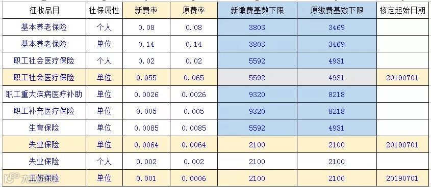 本次调整涉及:缴费基数(蓝色部分),费率(黄色部分)。