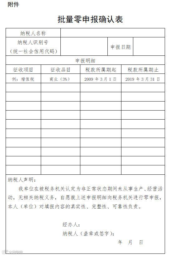 (一)处于非正常状态纳税人在办理税务注销前,需先解除非正常状态,补办纳税申报手续。符合以下情形的,税务机关可打印相应税种和相关附加的《批量零申报确认表》(见附件),经纳税人确认后,进行批量处理: