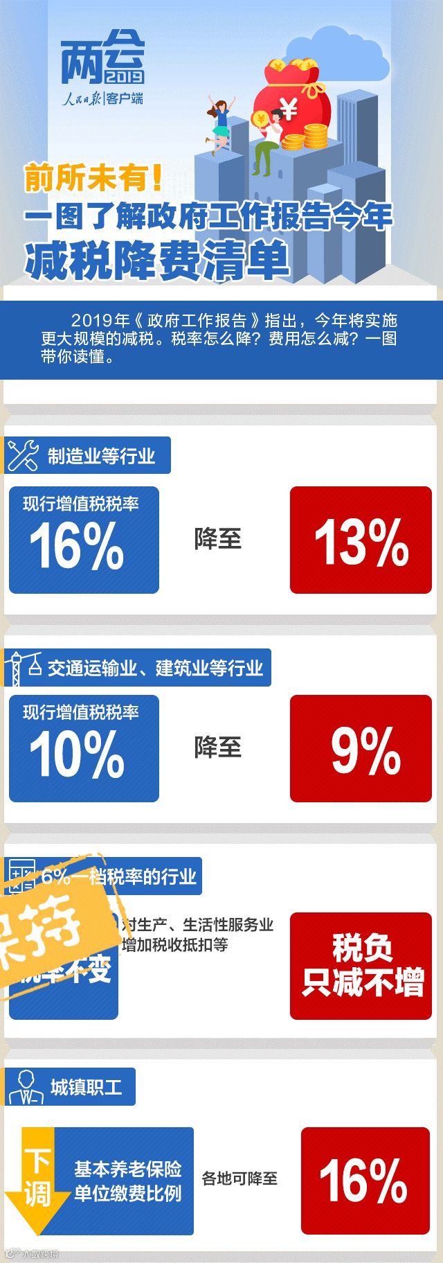 2019年3月5日,第十三届全国人民代表大会第二次会议在北京开幕。总理在做《政府工作报告》时明确指出,深化增值税改革,今年将制造业等行业现行16%的税率降至13%,将交通运输业、建筑业等行业现行10%的税率降至9%;保持6%一档的税率不变,但通过采取对生产、生活性服务业增加税收抵扣等配套措施,确保所有行业税负只减不增。
