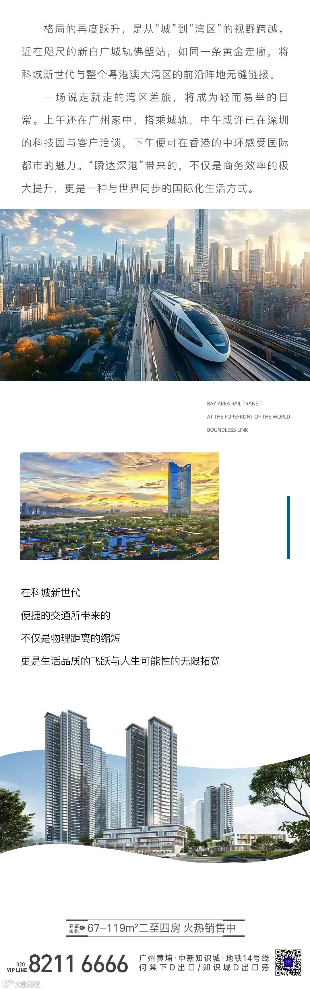 科城新世代 科城新世代是由科学城集团倾力打造的超600万㎡全优综合大城。项目位于广州市黄埔区中新知识城环九龙湖总部经济带,地铁14号线知识城站D出口旁,周边九龙湖、凤凰山等两湖两山环绕,首发产品约67-119㎡二至四房,总价仅100万起。