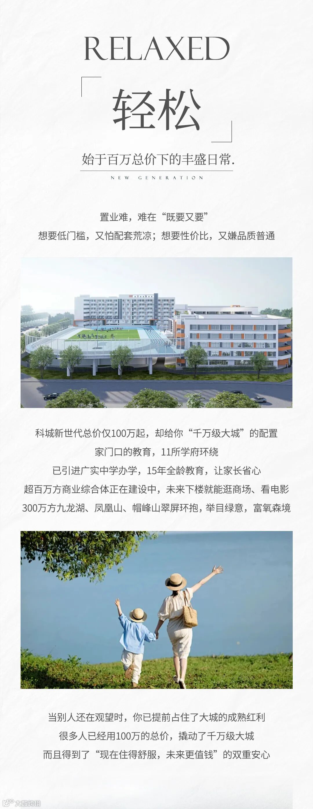 科城新世代 科城新世代是由科学城集团倾力打造的超600万㎡全优综合大城。项目位于广州市黄埔区中新知识城环九龙湖总部经济带,地铁14号线知识城站D出口旁,周边九龙湖、凤凰山等两湖两山环绕,首发产品约67-119㎡二至四房,总价仅100万起。