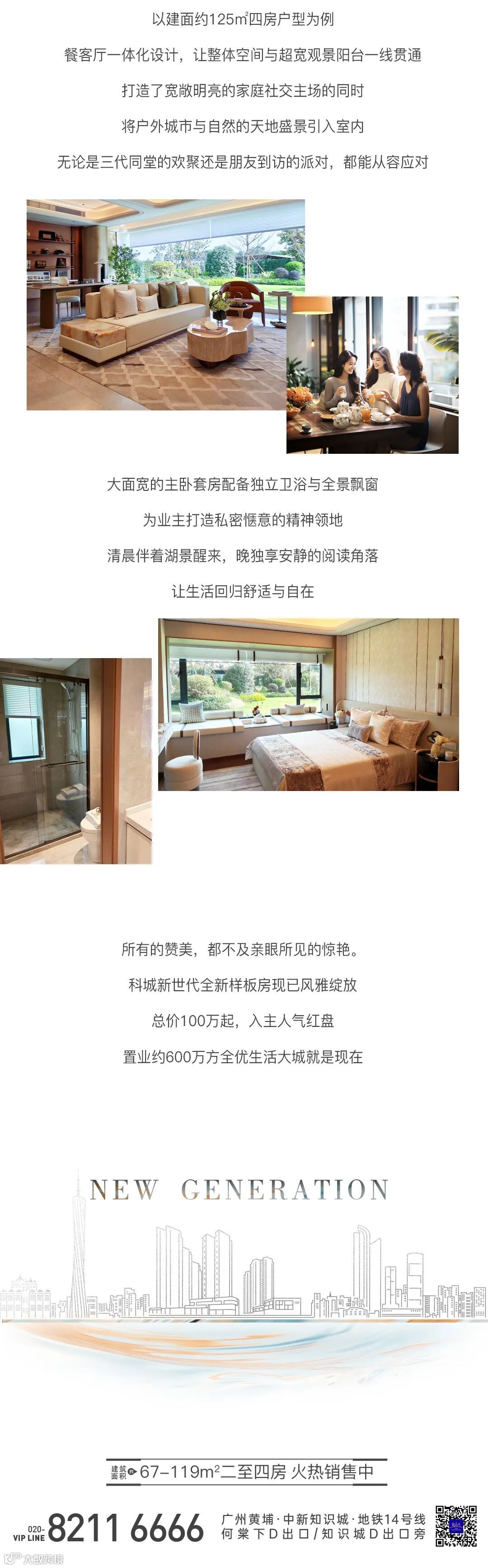 科城新世代 科城新世代是由科学城集团倾力打造的超600万㎡全优综合大城。项目位于广州市黄埔区中新知识城环九龙湖总部经济带,地铁14号线知识城站D出口旁,周边九龙湖、凤凰山等两湖两山环绕,首发产品约67-119㎡二至四房,总价仅100万起。