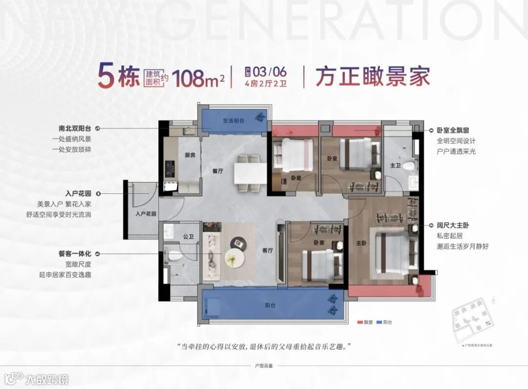 四房设计,为四代同堂的家庭提供了宽敞舒适的生活空间。合理的动静分区,保证了生活的私密性和便捷性,同时,南北双阳台,一处盛纳风景一处安放生活。
