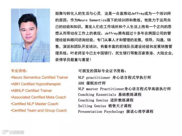3个培训日,24个课时,学员需全程参与,完成后也可获得Meta-Coaching System(大成教练体系)的《Coaching Genious》进阶教练证书。