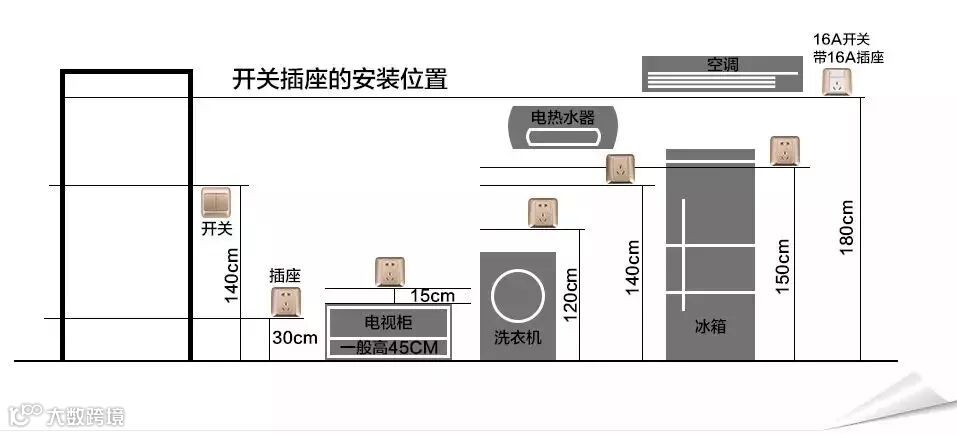 洗衣机插座距地面1.2米至1.5米之间,最好选择带开关三极插座;