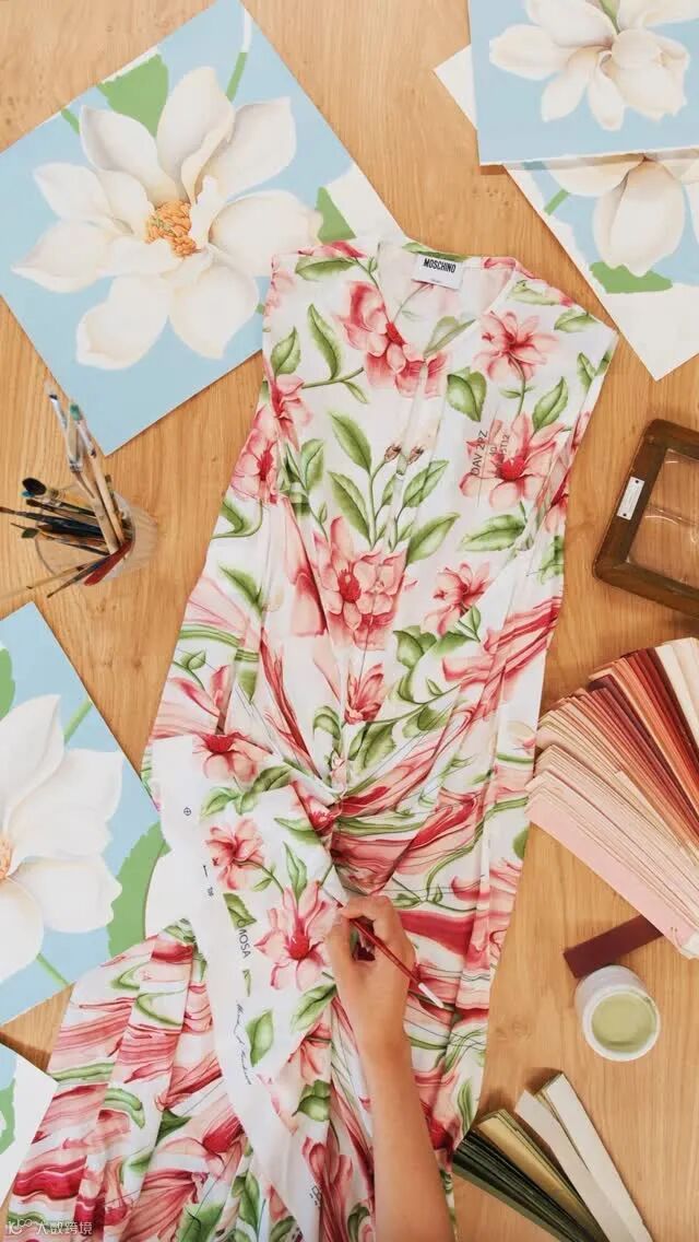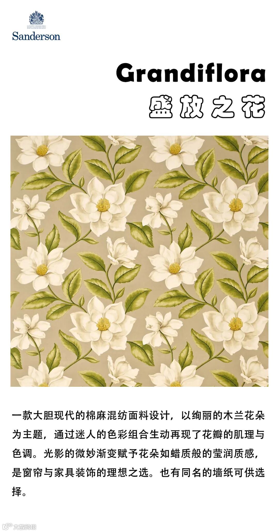 Grandiflora 系列以木兰花为主题,呈现大胆现代的设计诠释。Moschino通过强化纹理与色调,令花朵更显鲜活迷人。Sanderson评价道:“在时装屋迷人的新配色演绎下,Grandiflora中的木兰花足以征服每一颗向往美的心。”