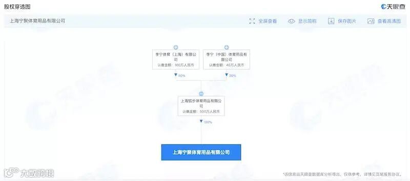 根据工商信息显示,上海宁聚体育用品有限公司由上海狐步体育用品有限公司100%持股,后者由李宁体育(上海)有限公司持股80%、李宁(中国)体育用品有限公司持股20%。