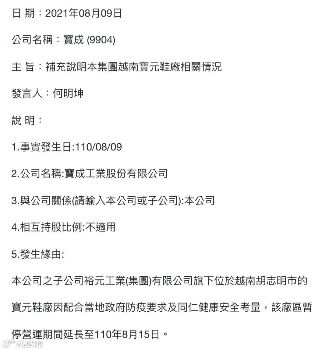 本公司之子公司裕元工业(集团)有限公司旗下位于越南胡志明市的宝元鞋厂因配合当地政府防疫要求及同仁健康安全考量,该厂区暂停营运期间延长至2021年8月15日。