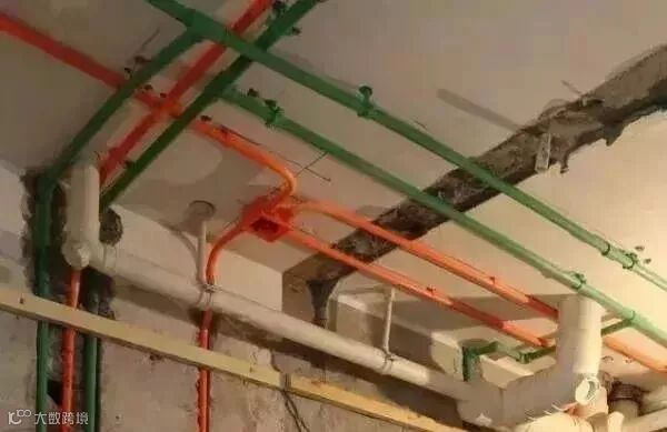 水电不能同槽。有防水要求的区域(厨房、卫生间、阳台)地面不能布线。所以厨卫的线路一般都走顶,且是电上水下的走法。