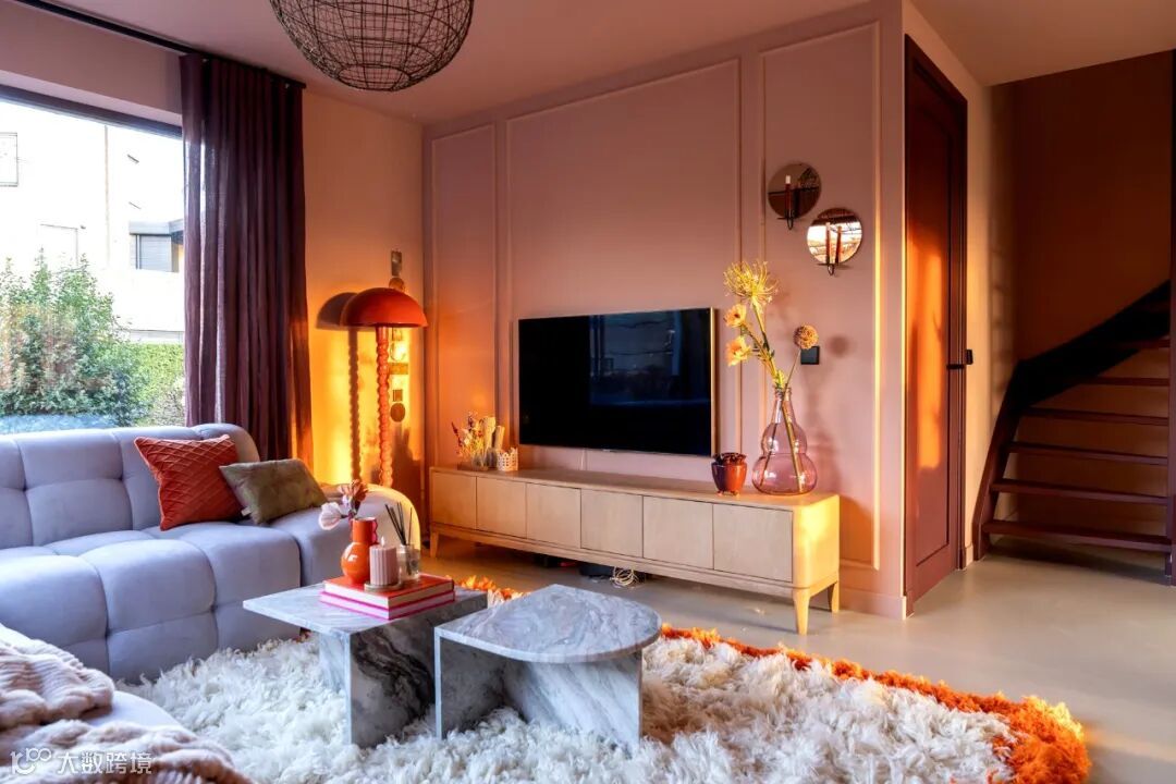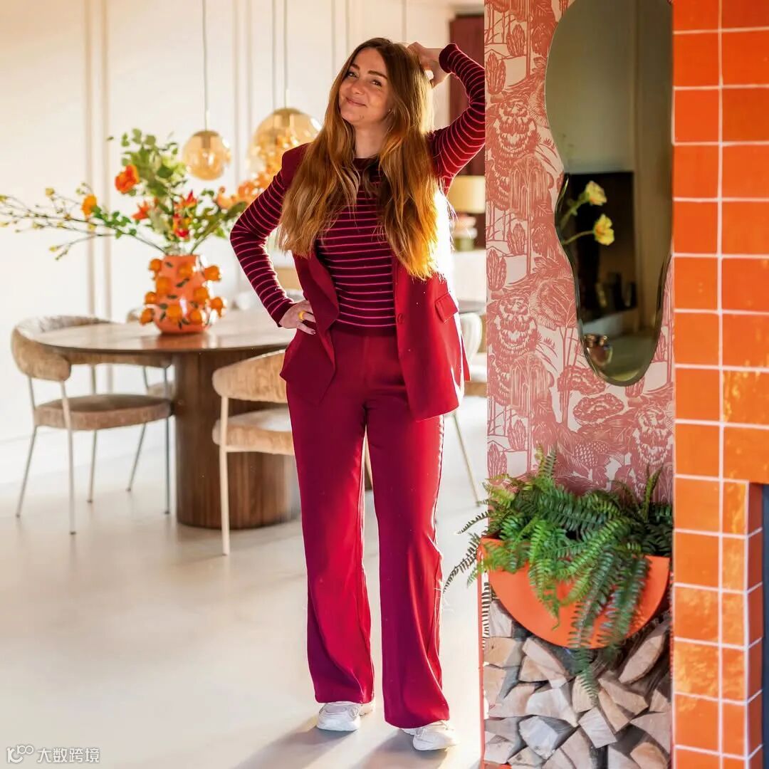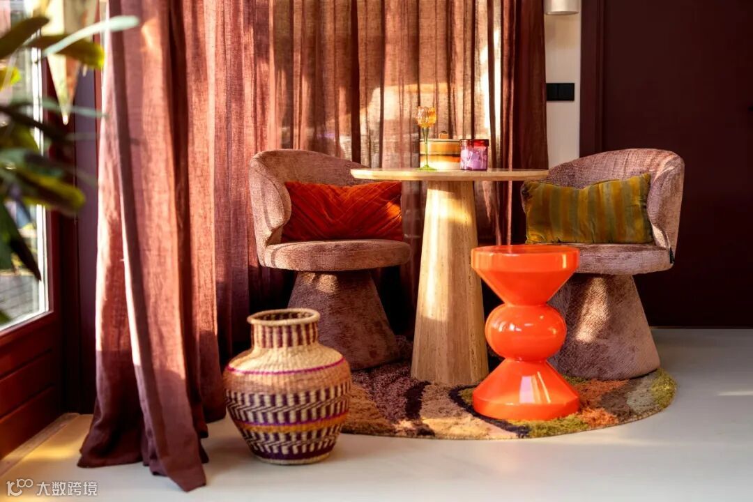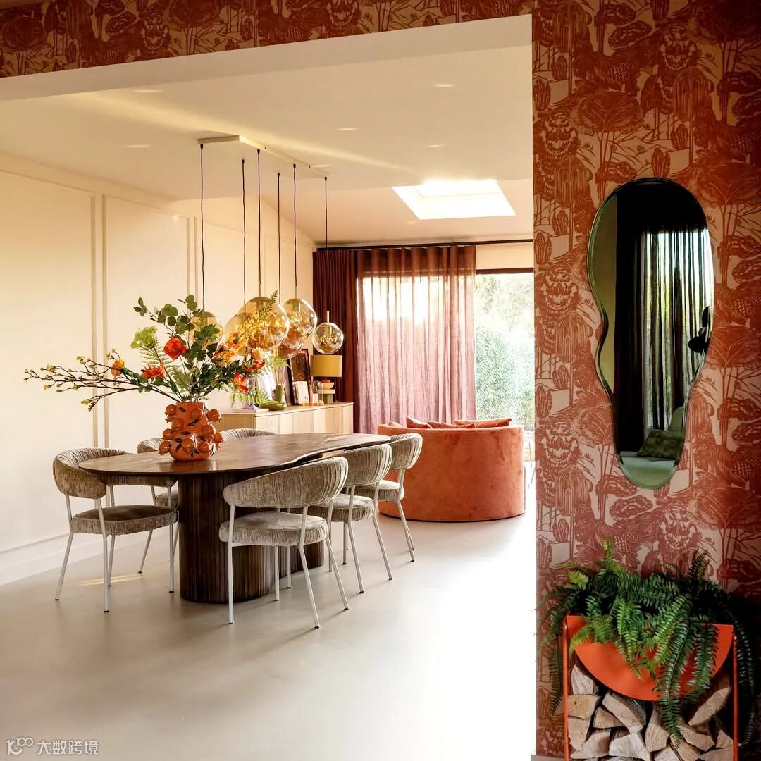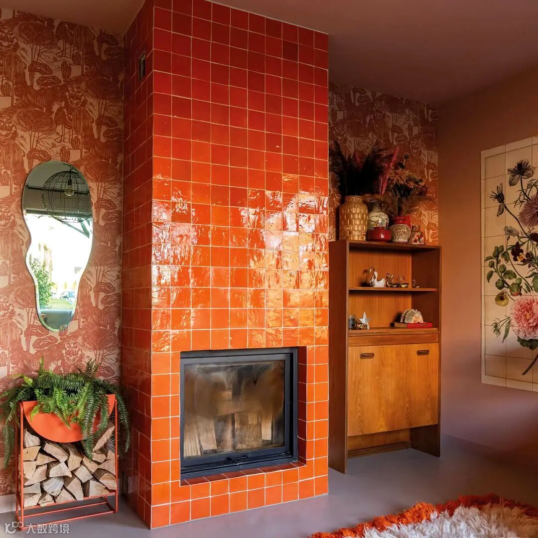以橙色色调为装饰的基础。对劳拉来说,这种颜色代表着温暖、活力和幸福。她决定在大胆的橙色瓷砖防火墙旁边的墙上贴上Eijffinger Groovy系列的壁纸。这款壁纸以森林般的印花为特色,俏皮的图案与温暖的色调相结合,给空间带来了活泼的氛围。
