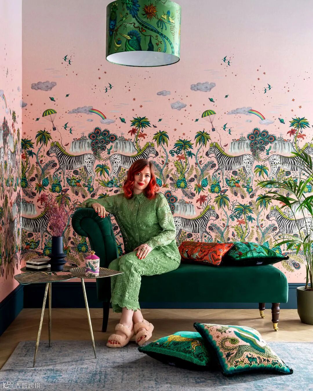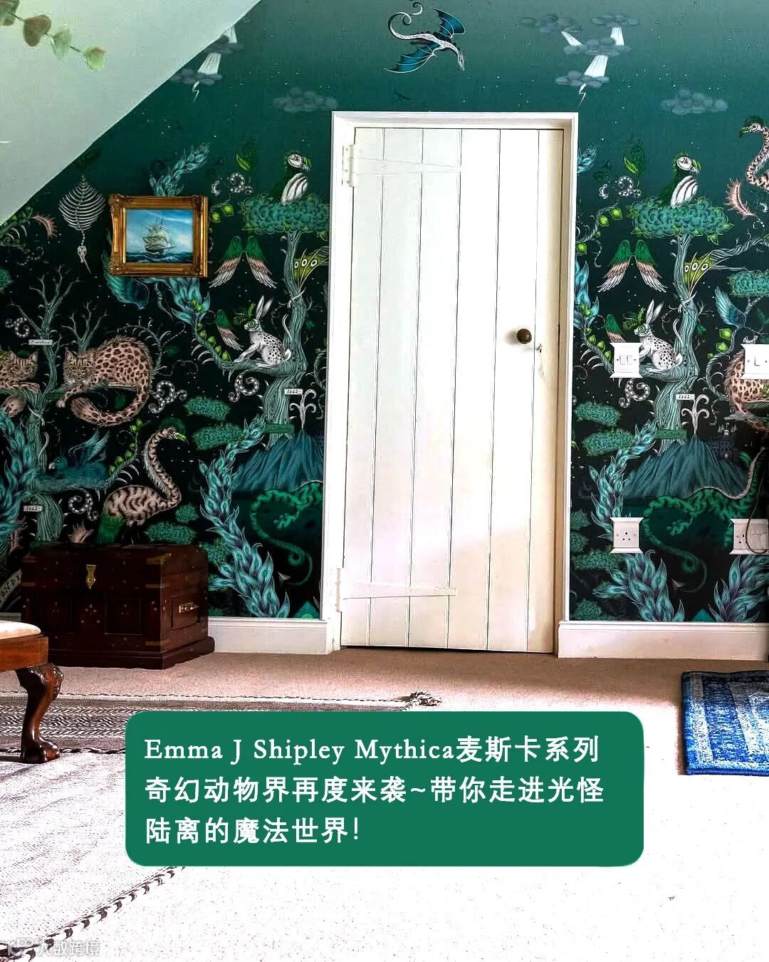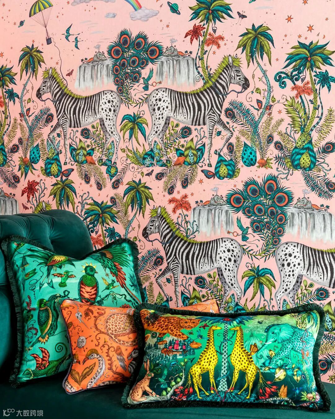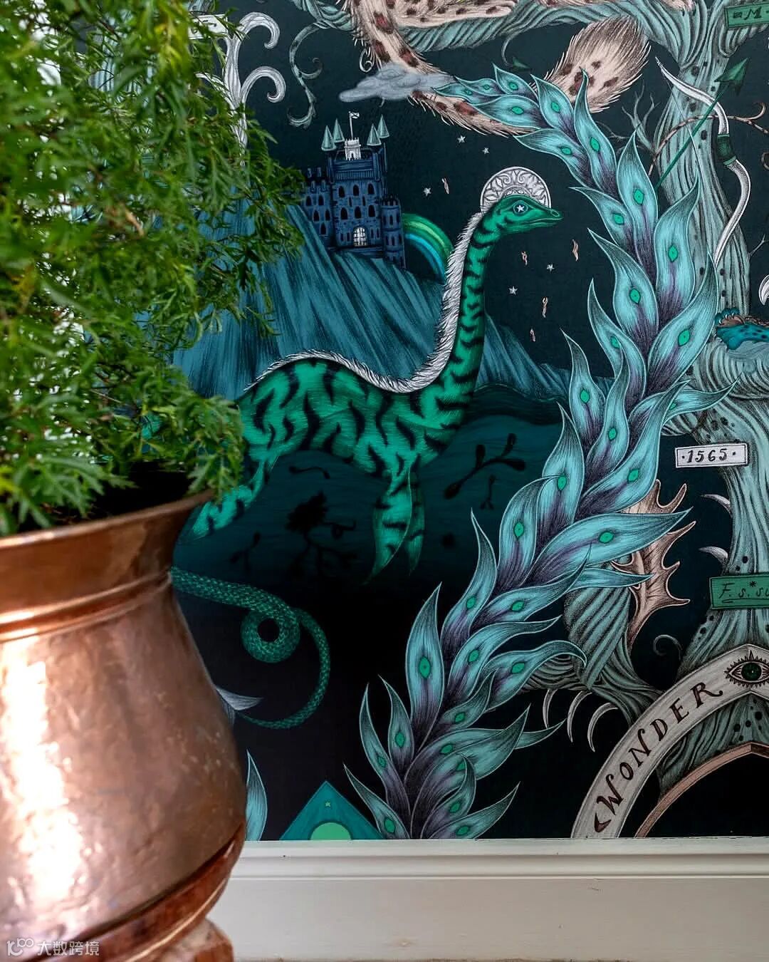 在这幅壁画中你会发现一场未知的冒险,灵感来自儒勒·凡尔纳的冒险故事和非洲迷人的野生动物。Emma J Shipley手绘的孔雀、尾斑马、风叶、高耸的山脉和远处的强大恐龙,在这个复杂的设计中,在微妙的玫瑰石英色和烟雾缭绕的午夜背景色下,可以探索整个世界。