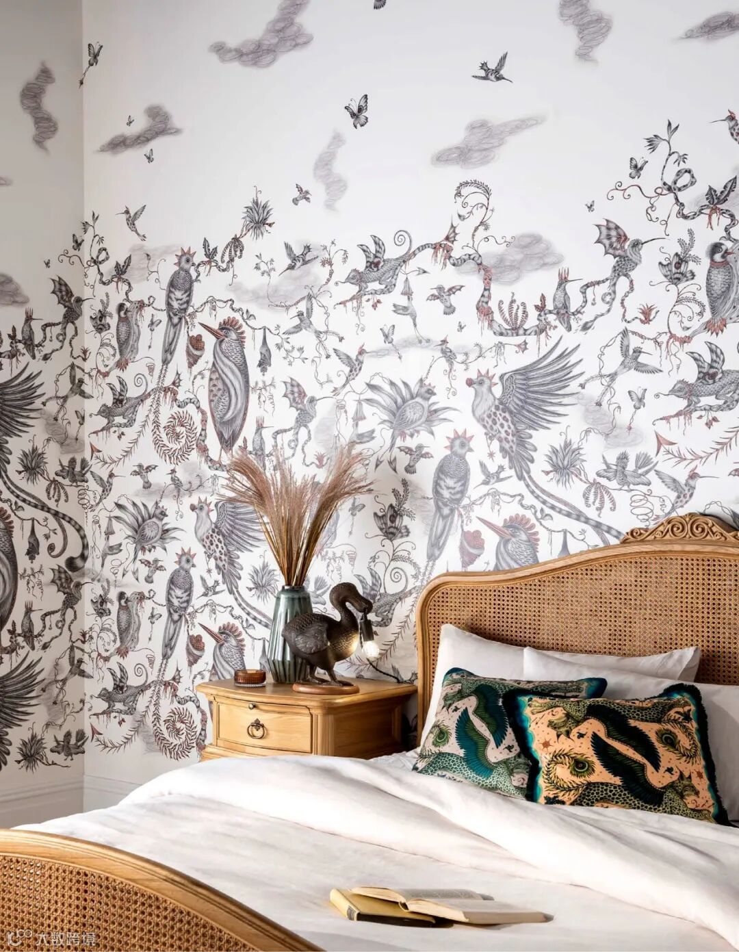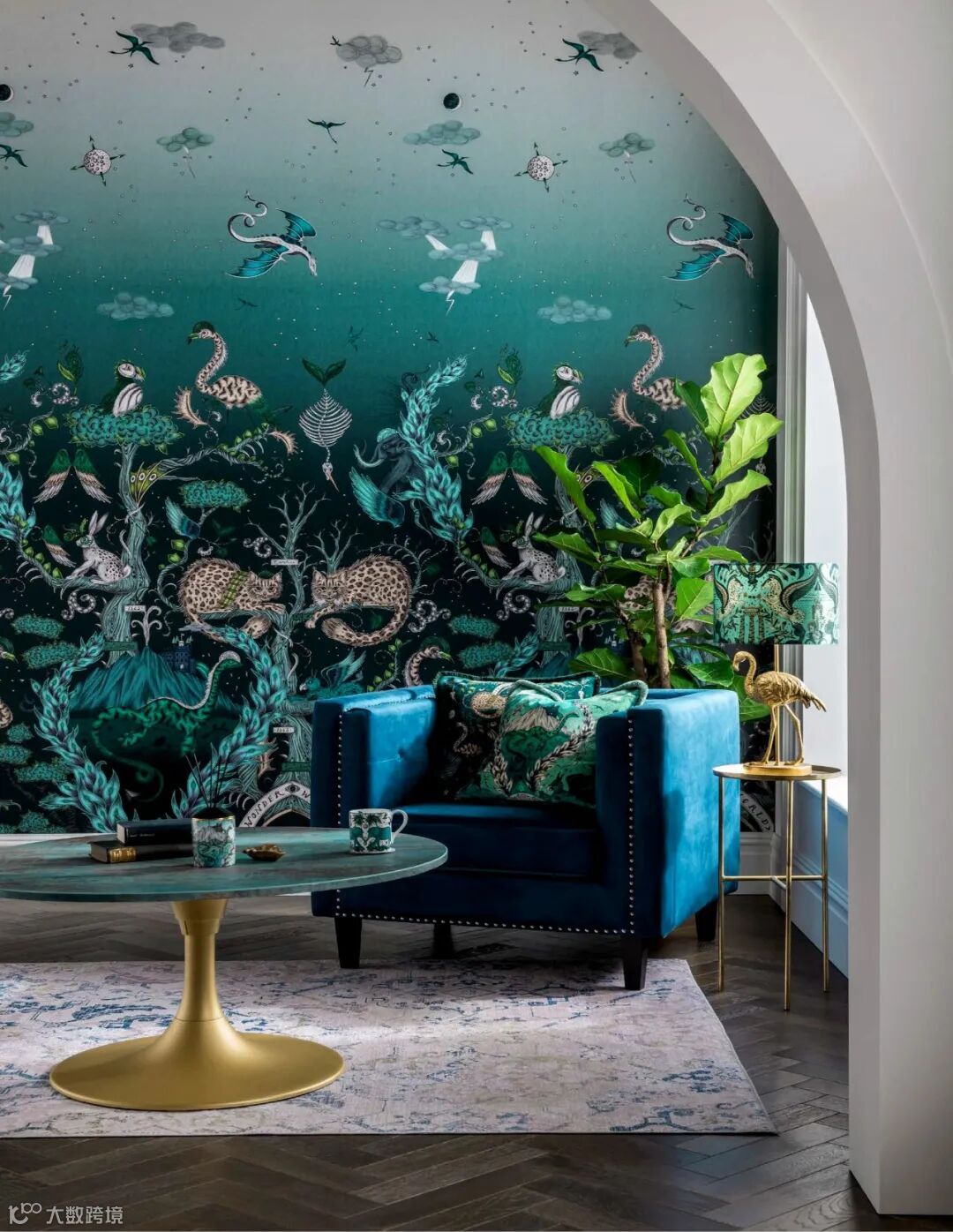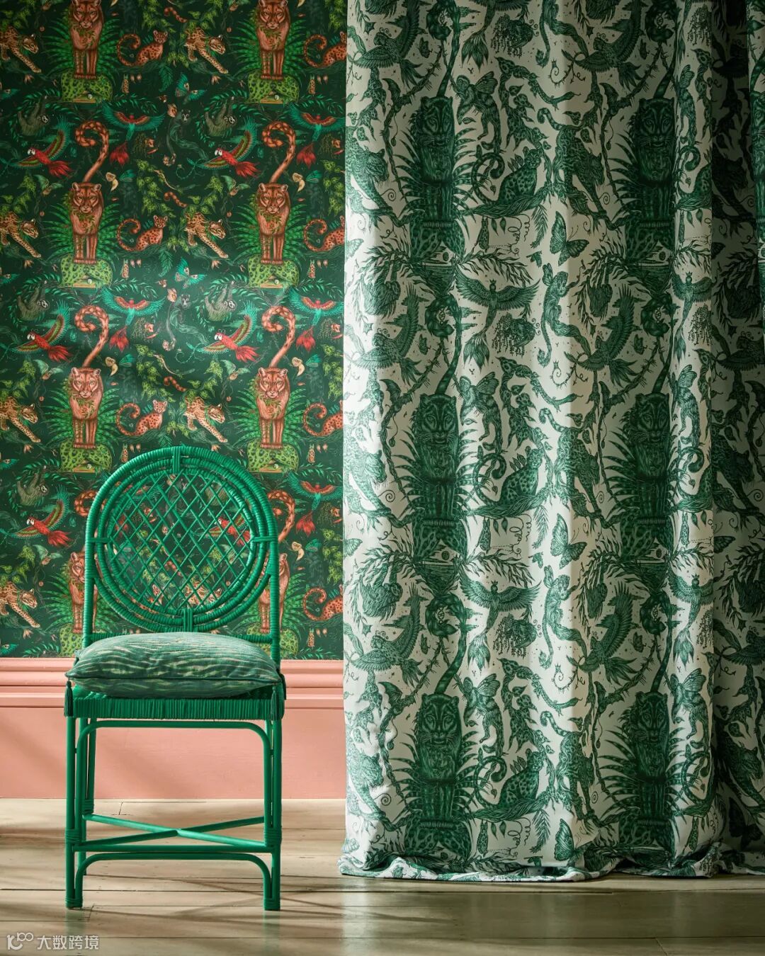 在这幅壁画中你会发现一场未知的冒险,灵感来自儒勒·凡尔纳的冒险故事和非洲迷人的野生动物。Emma J Shipley手绘的孔雀、尾斑马、风叶、高耸的山脉和远处的强大恐龙,在这个复杂的设计中,在微妙的玫瑰石英色和烟雾缭绕的午夜背景色下,可以探索整个世界。