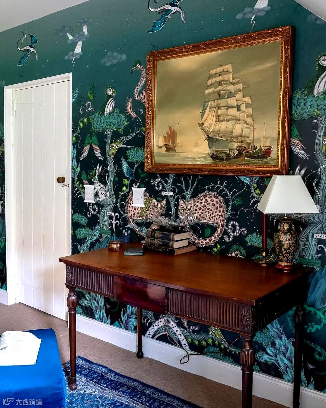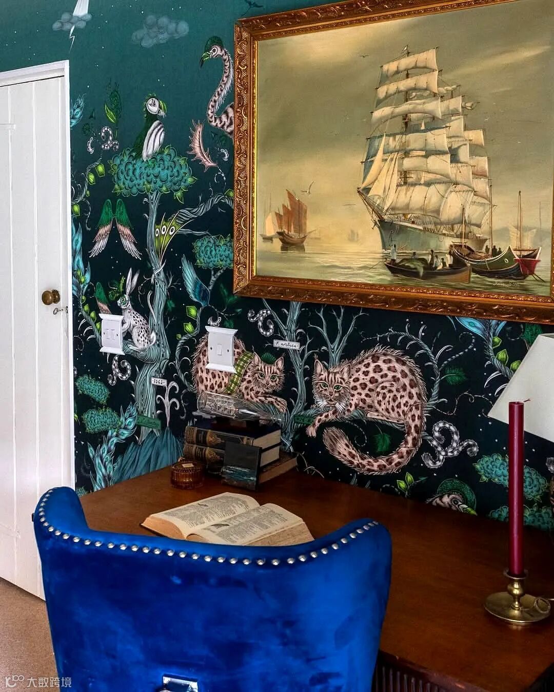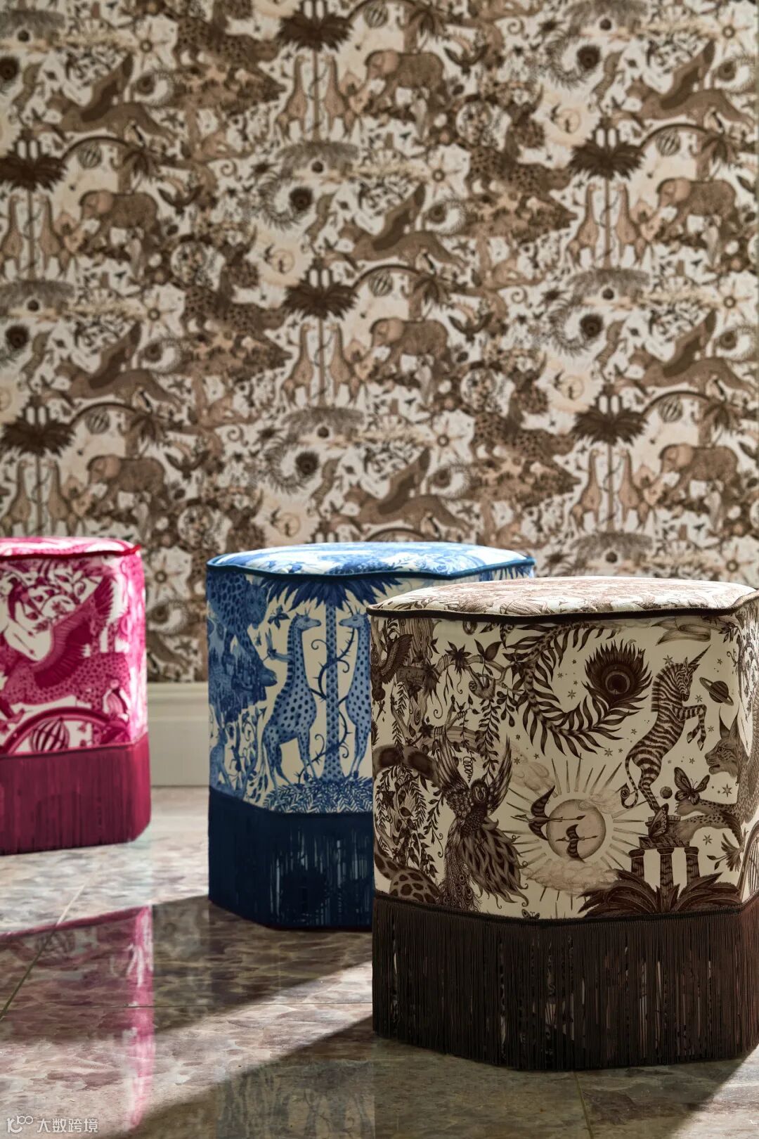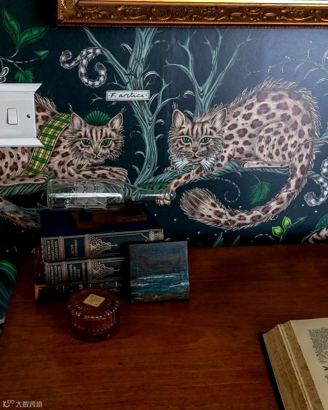 在这幅壁画中你会发现一场未知的冒险,灵感来自儒勒·凡尔纳的冒险故事和非洲迷人的野生动物。Emma J Shipley手绘的孔雀、尾斑马、风叶、高耸的山脉和远处的强大恐龙,在这个复杂的设计中,在微妙的玫瑰石英色和烟雾缭绕的午夜背景色下,可以探索整个世界。