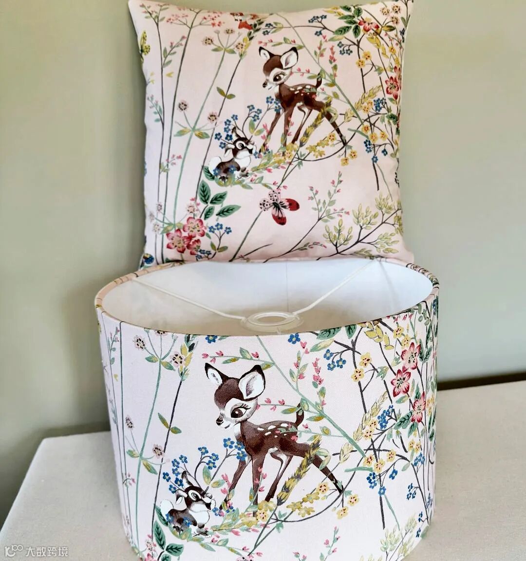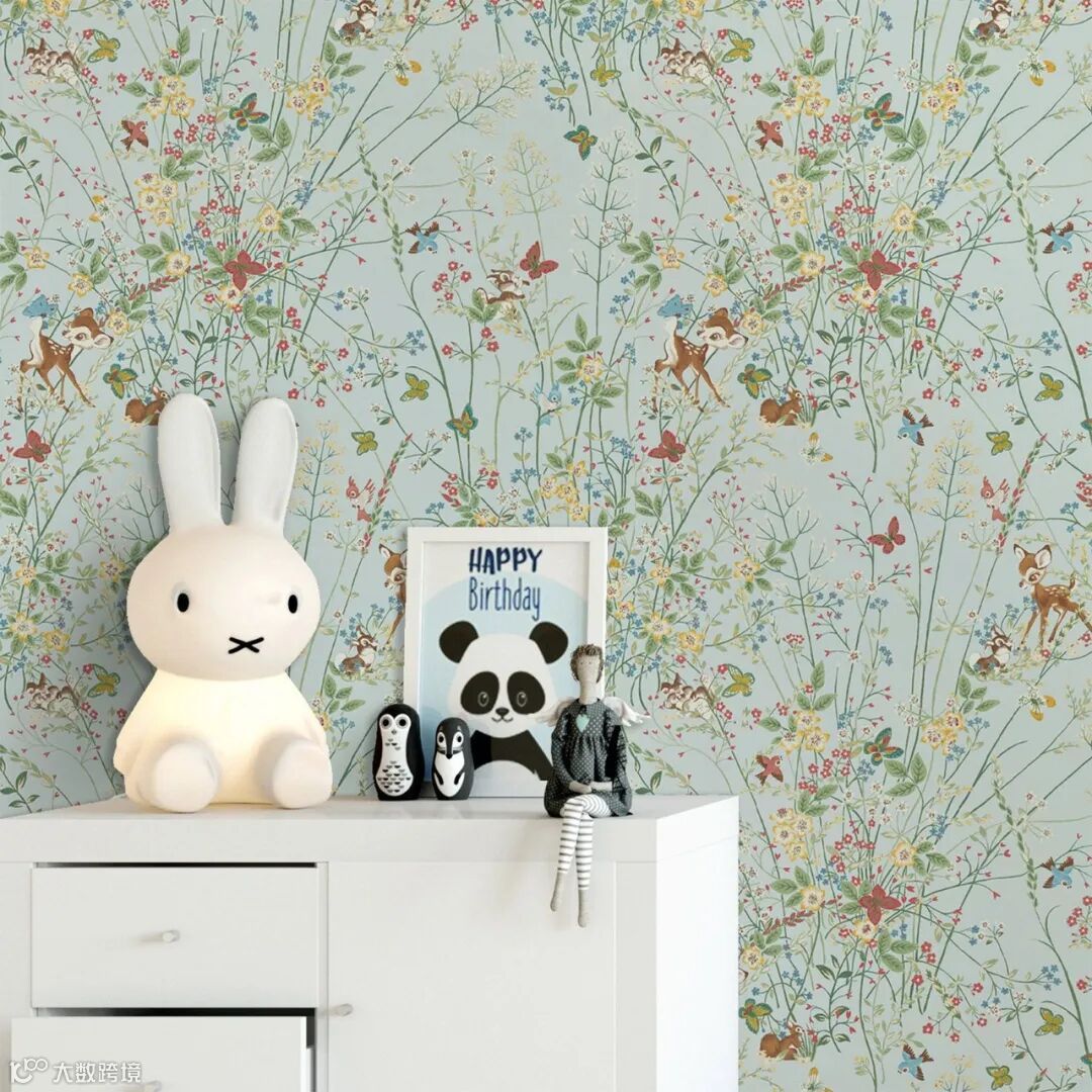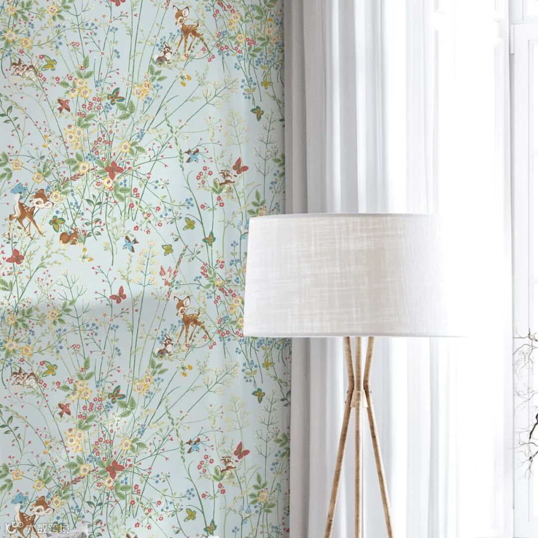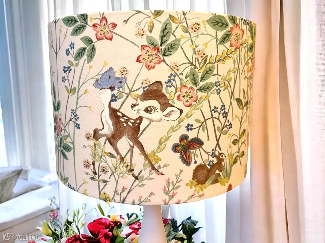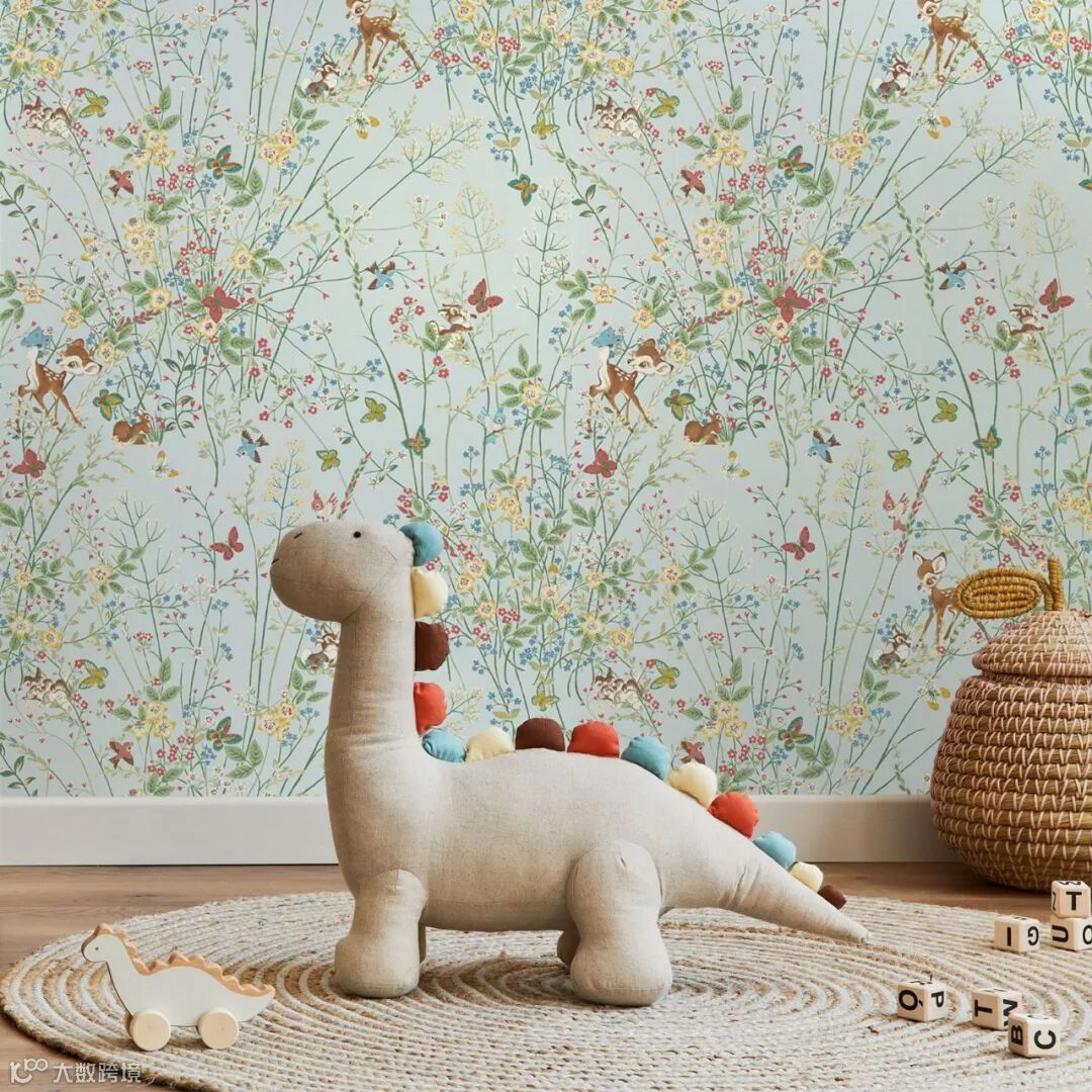 “鲜花朵朵,木叶纷纷。图案的主画面由各种各样形态各异的花草、叶子组成,穿插小鹿斑比等卡通形象,整体格调小清新又不失甜美活泼。”