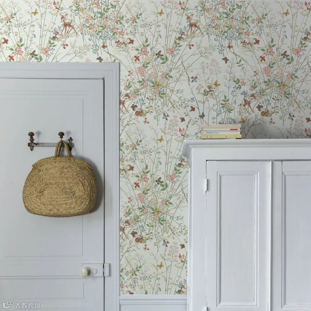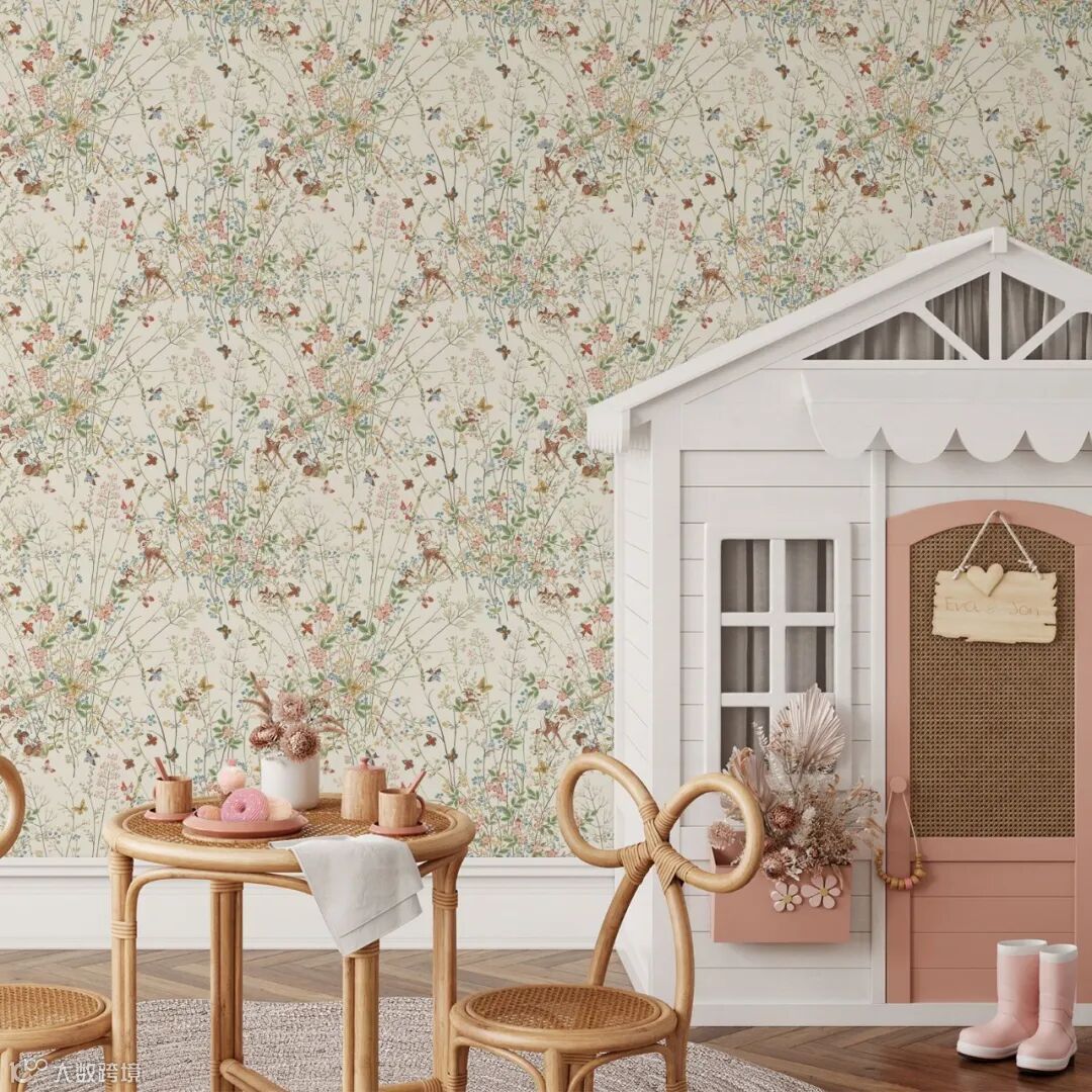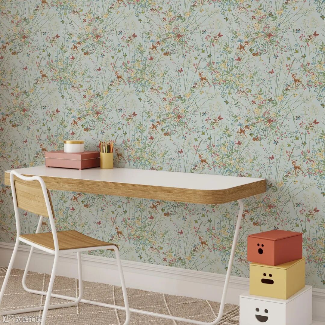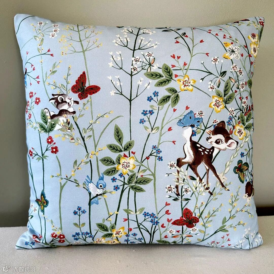 “鲜花朵朵,木叶纷纷。图案的主画面由各种各样形态各异的花草、叶子组成,穿插小鹿斑比等卡通形象,整体格调小清新又不失甜美活泼。”