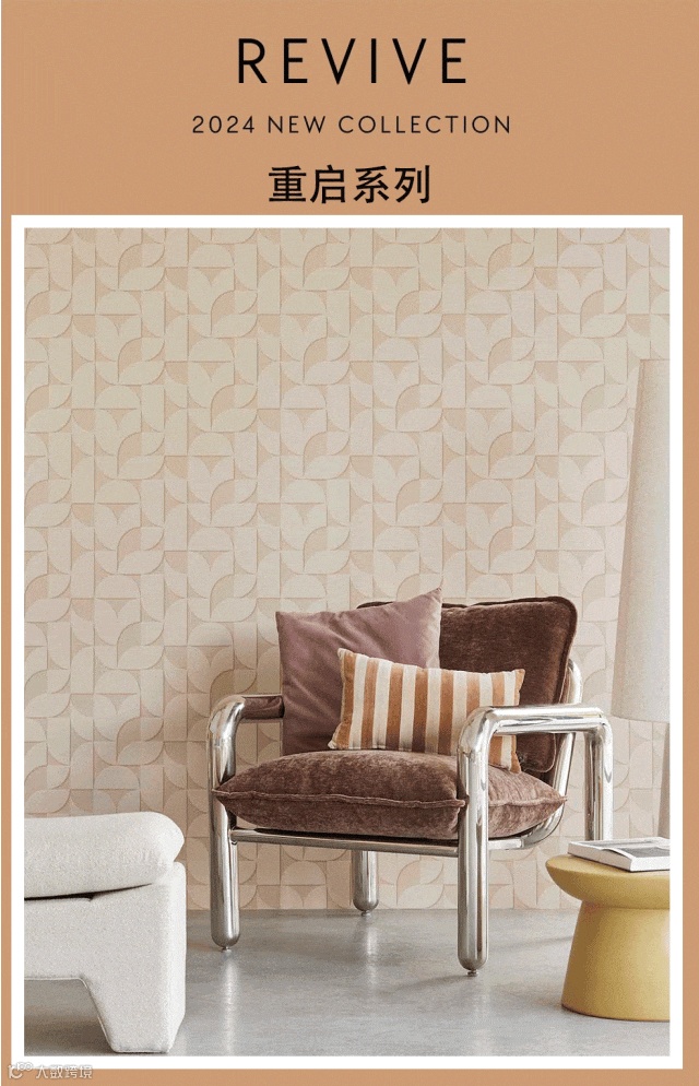 Revive重启系列融合了时代经典复古和当代潮流设计。有着哑光亚麻壁纸,线条迷人,木纹效果的圆形几何图案和柔软的纺织品外观,营造出专属于你的独特复古氛围。具有风化光泽的的戏剧性图案和超现代配色的交替条纹设计,为您的墙壁带来壮观的新面貌。