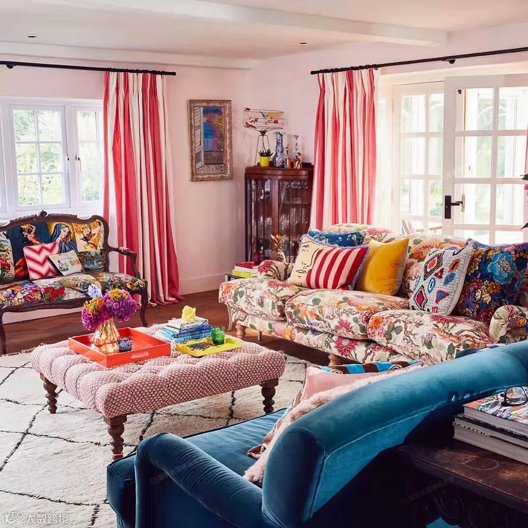 “我的方法很有趣,我软装设计用到许多不同图案的方法是使用一个相当紧凑的调色板,这样可以防止一切陷入不连贯的混乱。首先确定一个主色,例如,这可能是一款印花棉布,它有一个主色调,你可以从中绘制你的颜色。你可以在一个方案中满满加入的其它颜色而且没有上限,但我的建议是确保你至少有三种感兴趣的颜色。有了你的核心色调,你就可以随心所欲地混搭——条纹、波点、花哨的花朵、复古面料和绝妙的几何图案。还有,记住,做方案的时候一定要穿一件普通的布料,因为它有助于保持平静。”