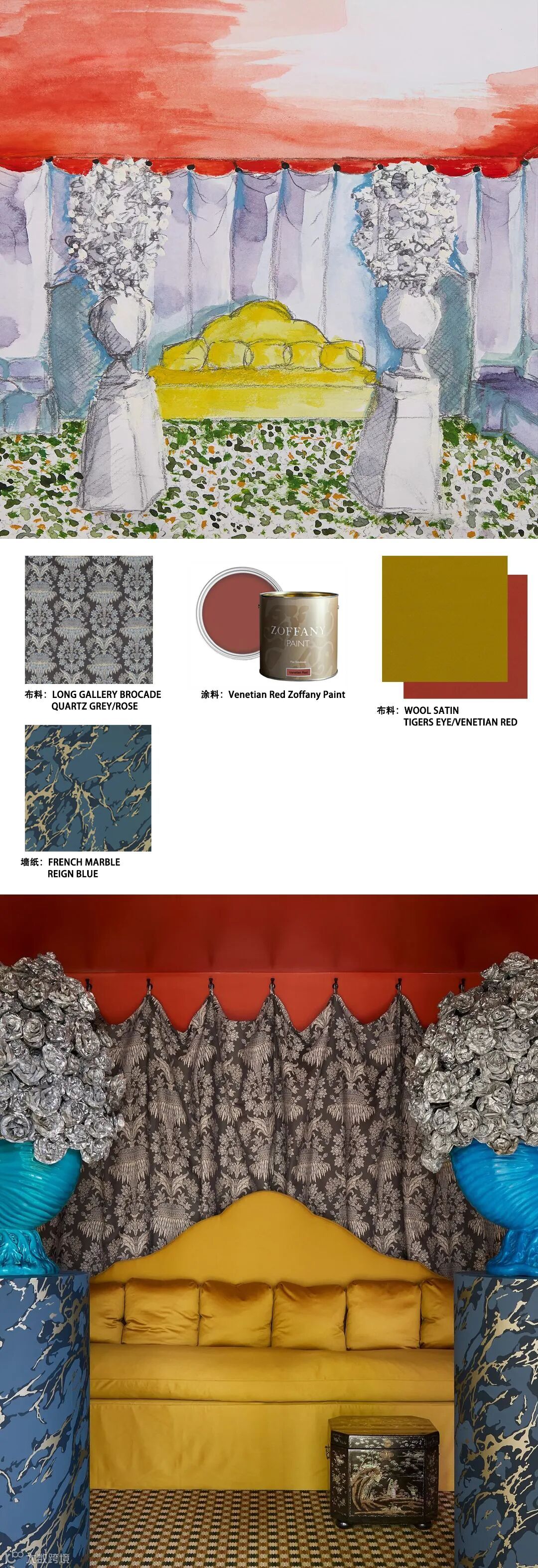 本尼迪克特说:“这个空间把Zoffany的产品放在最前面和最中心的位置,突出Zoffany品牌对英国制造业的贡献,同时庆祝织物厂的工艺。我的作品专注于材料完整性和历史研究,从各种视觉艺术参考中汲取灵感,并将其与幽默交织在一起。我的工作是详细的,基于来源,但最终是为了观众的享受!”