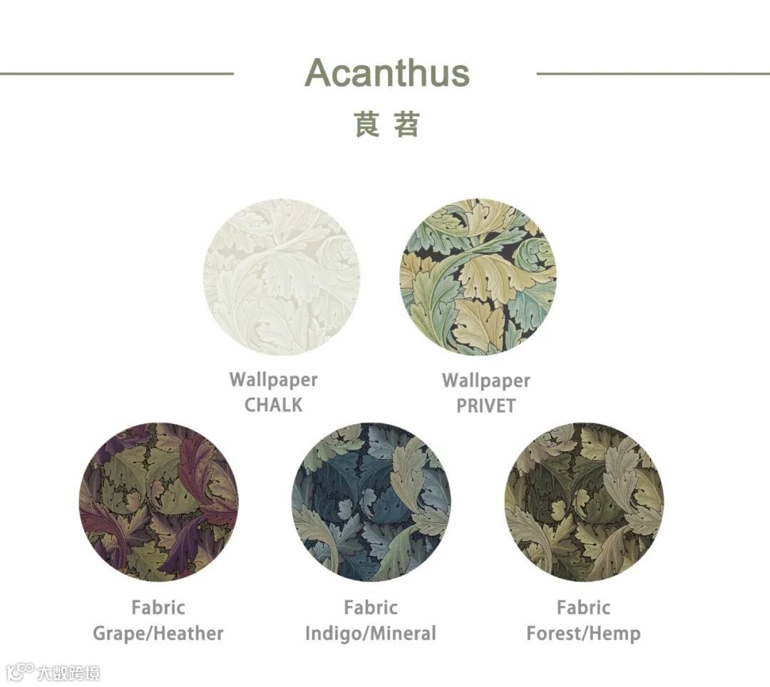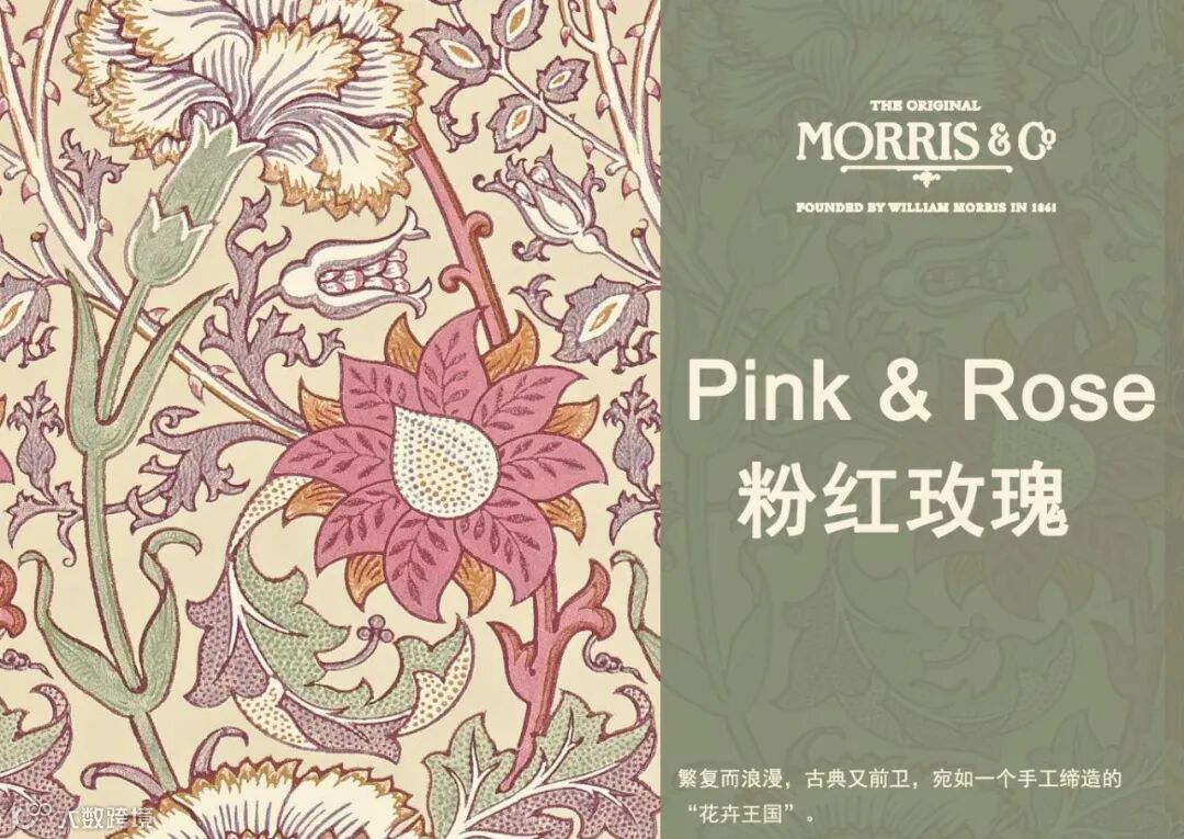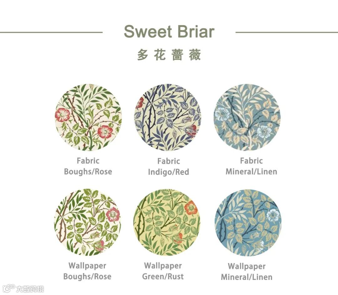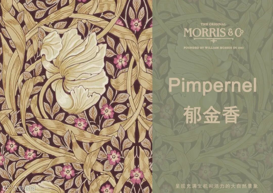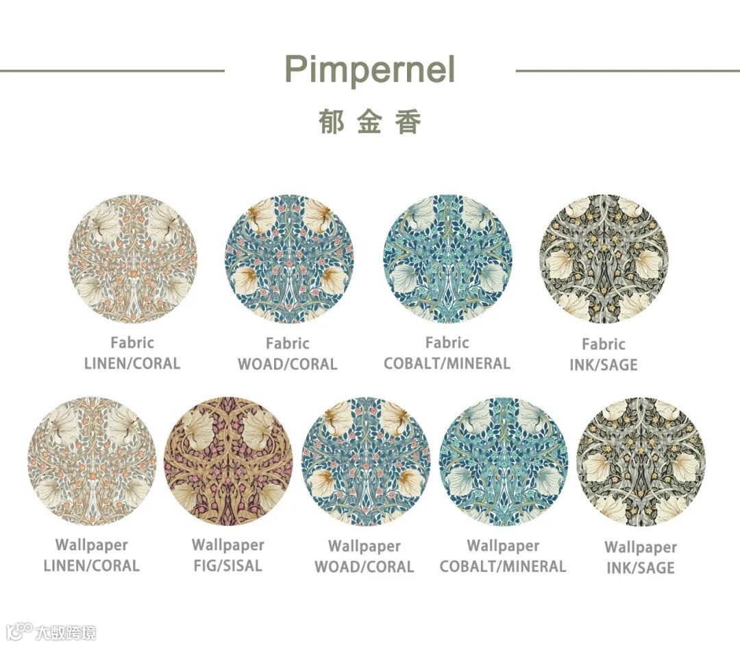 William Morris尤其擅长取材于大自然界的植物花草,Pimpernel图案设计灵感来源于1876年的同名墙纸,以卷曲花茎环绕着微风中吹动的郁金香花朵设计图案,Pimpernel图案用旋转方式排列强调图案的装饰性、结构的对称性和排列的韵律,将充满生机和活力的大自然精致呈现在墙纸、面料等作品中,呈现出图案形化的现代风格。威廉·莫里斯(William Morris)自己在牛津郡凯姆斯科特庄园(Kelmscott Manor)装饰自己的餐厅时,也曾选择这种设计。