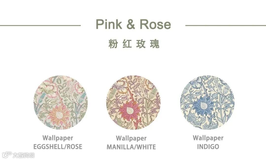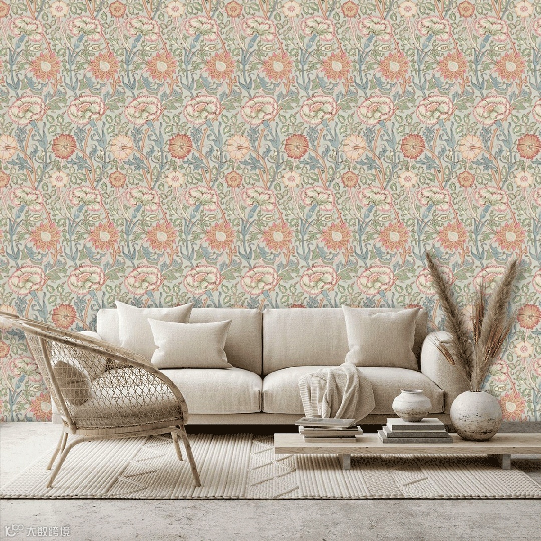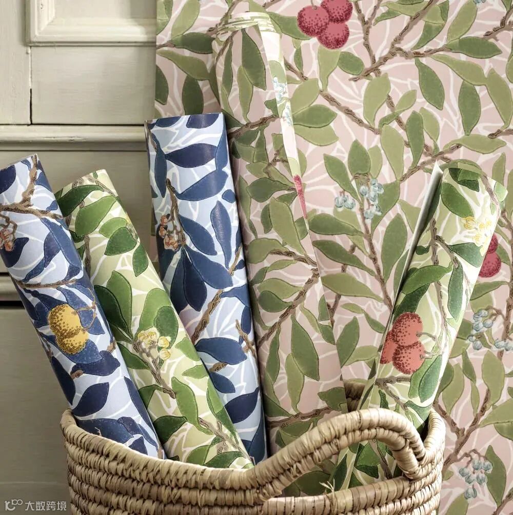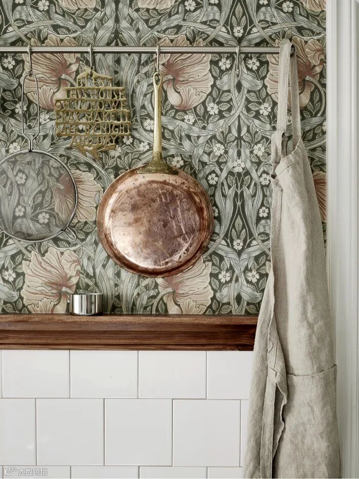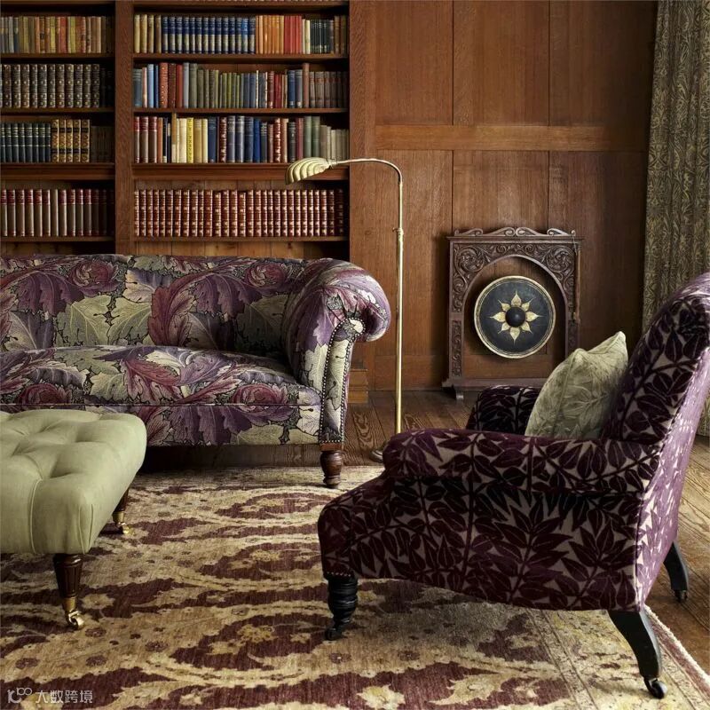 William Morris尤其擅长取材于大自然界的植物花草,Pimpernel图案设计灵感来源于1876年的同名墙纸,以卷曲花茎环绕着微风中吹动的郁金香花朵设计图案,Pimpernel图案用旋转方式排列强调图案的装饰性、结构的对称性和排列的韵律,将充满生机和活力的大自然精致呈现在墙纸、面料等作品中,呈现出图案形化的现代风格。威廉·莫里斯(William Morris)自己在牛津郡凯姆斯科特庄园(Kelmscott Manor)装饰自己的餐厅时,也曾选择这种设计。