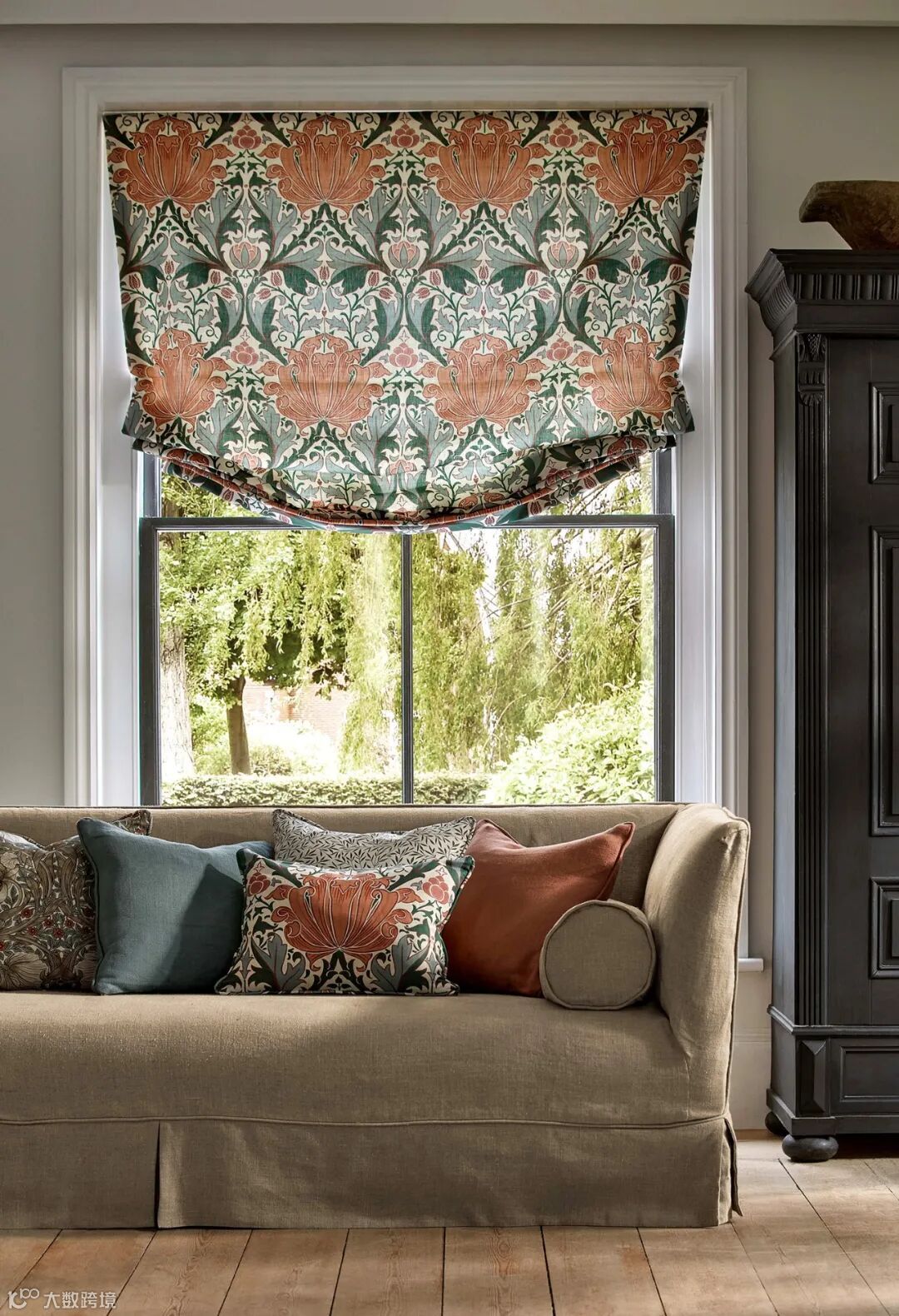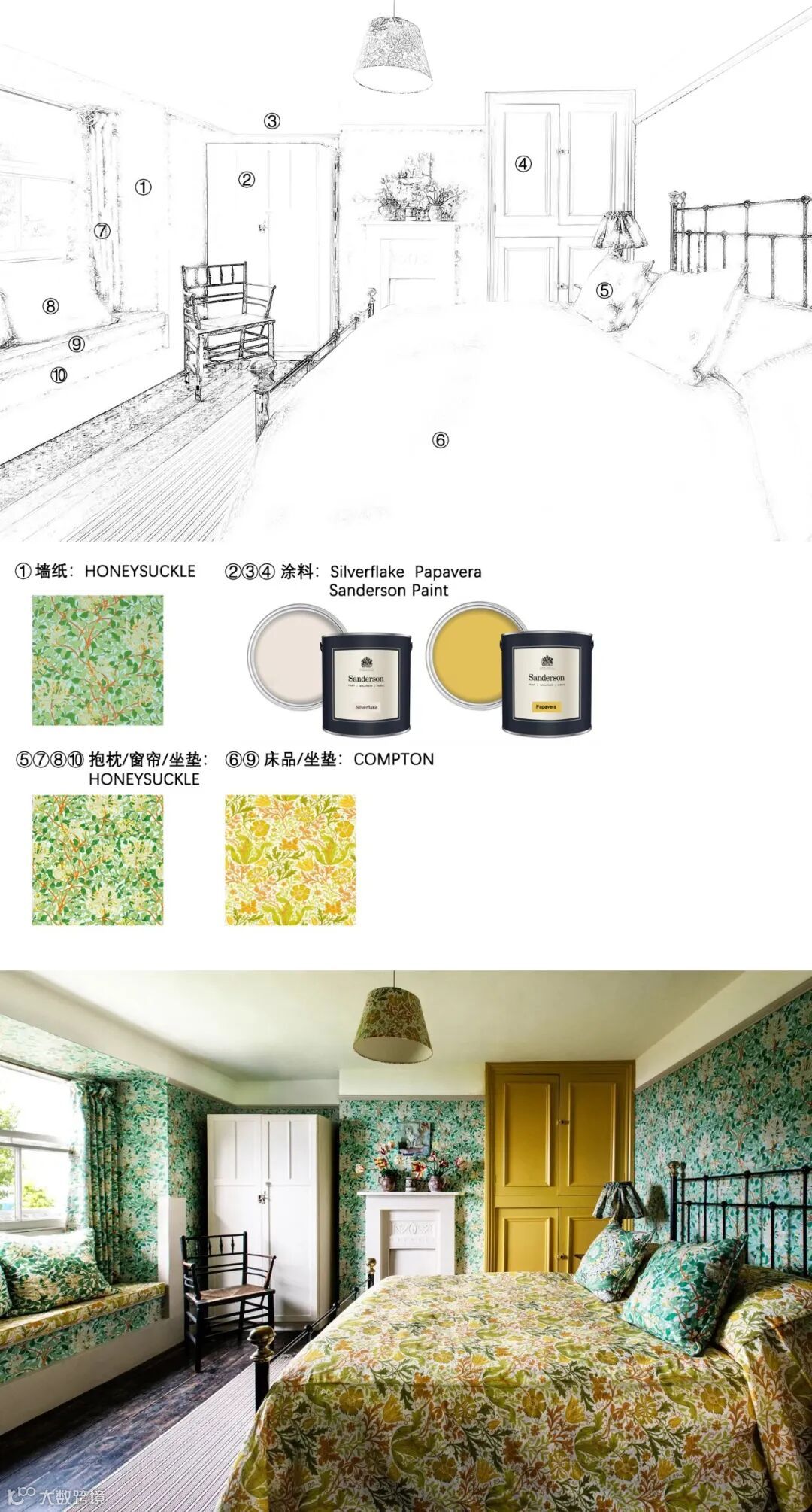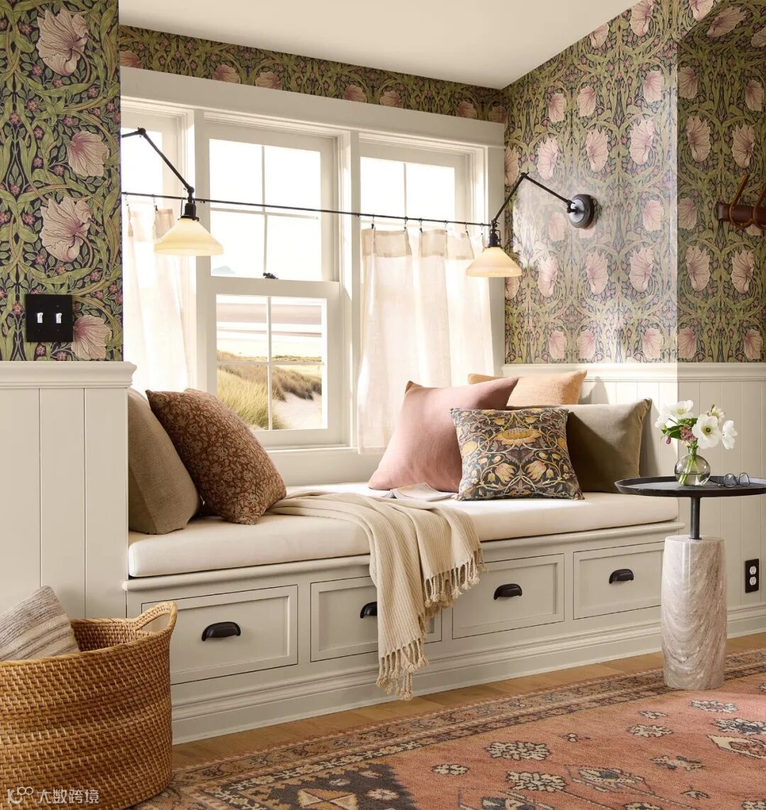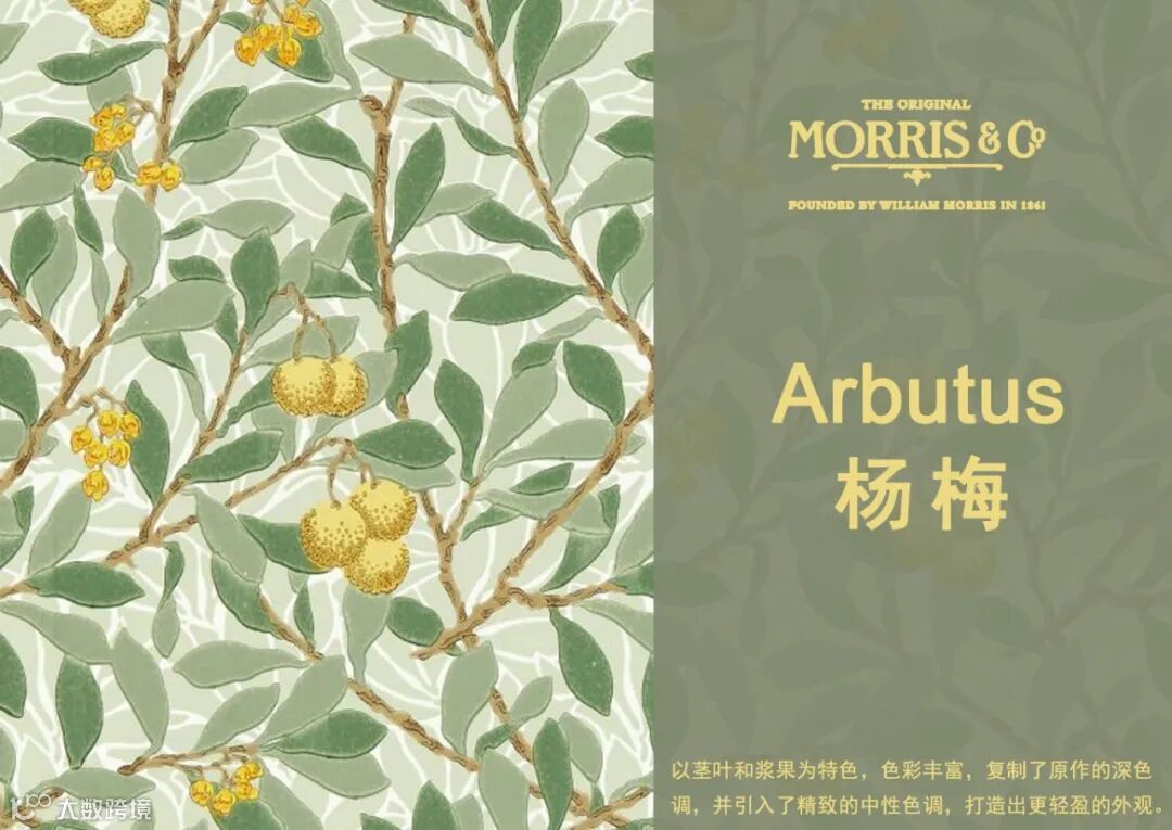 William Morris尤其擅长取材于大自然界的植物花草,Pimpernel图案设计灵感来源于1876年的同名墙纸,以卷曲花茎环绕着微风中吹动的郁金香花朵设计图案,Pimpernel图案用旋转方式排列强调图案的装饰性、结构的对称性和排列的韵律,将充满生机和活力的大自然精致呈现在墙纸、面料等作品中,呈现出图案形化的现代风格。威廉·莫里斯(William Morris)自己在牛津郡凯姆斯科特庄园(Kelmscott Manor)装饰自己的餐厅时,也曾选择这种设计。
