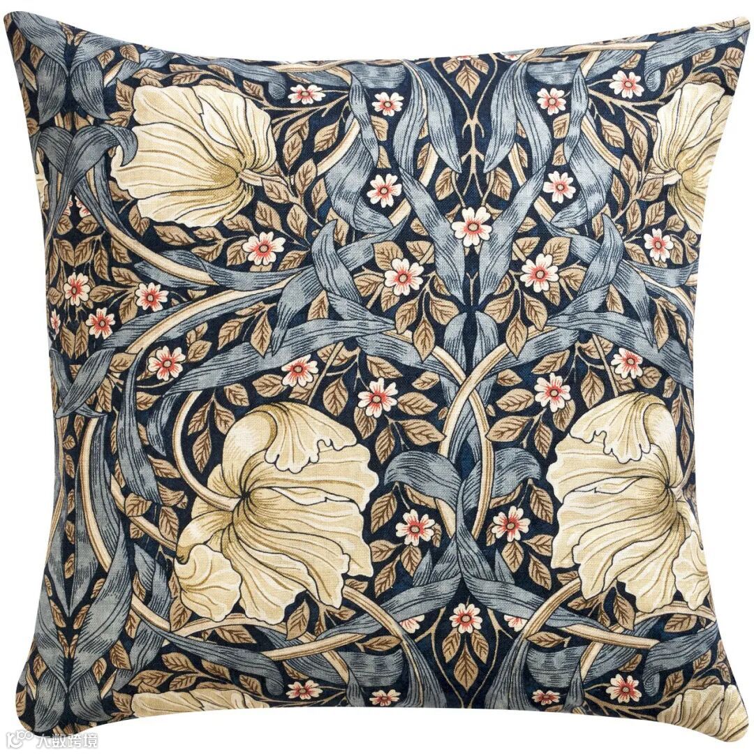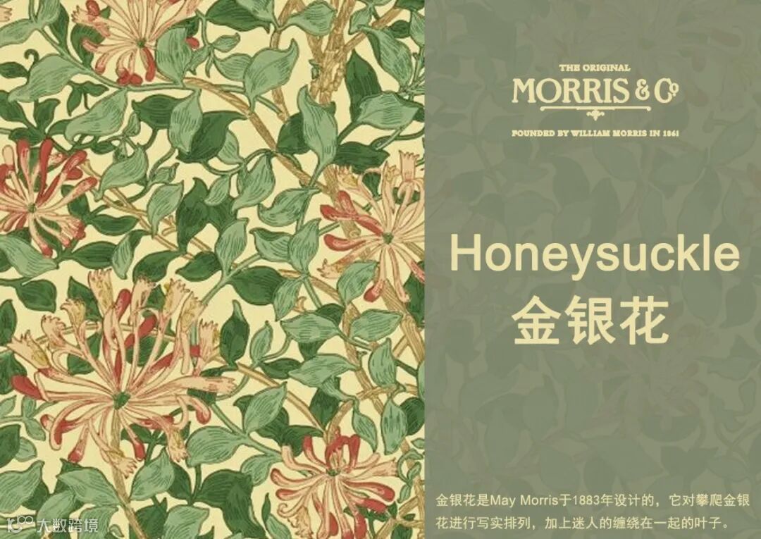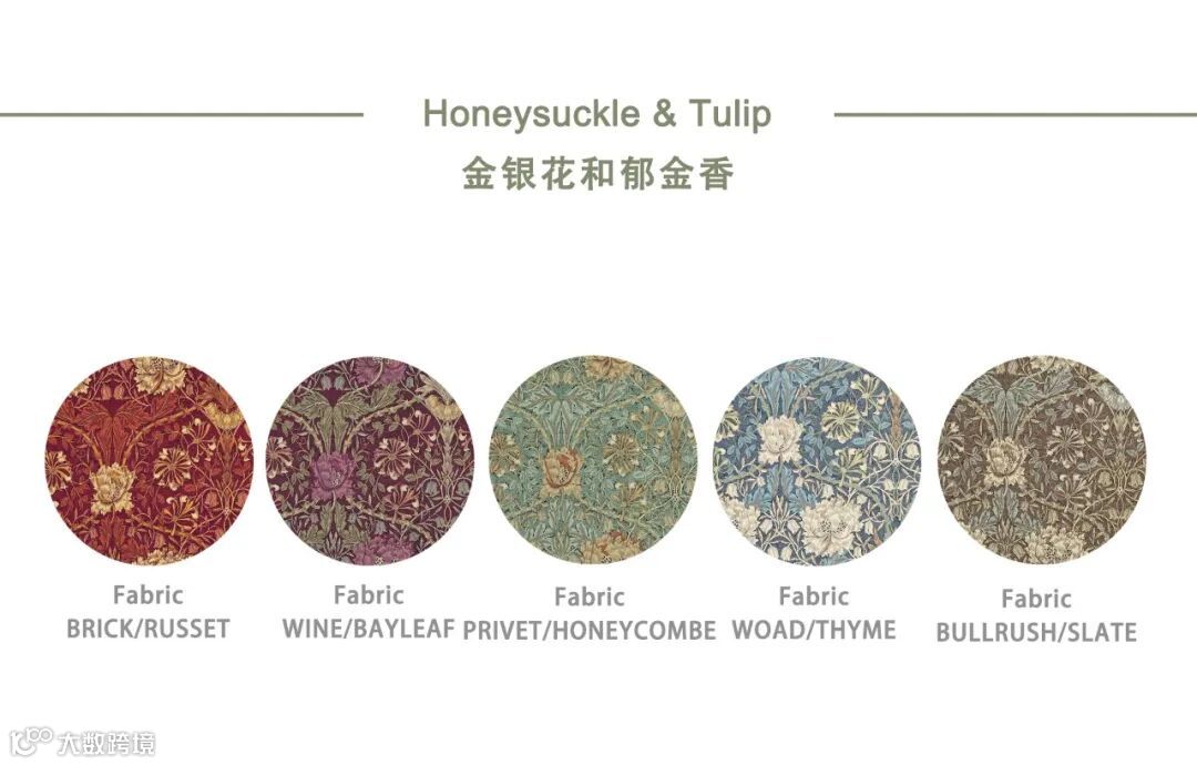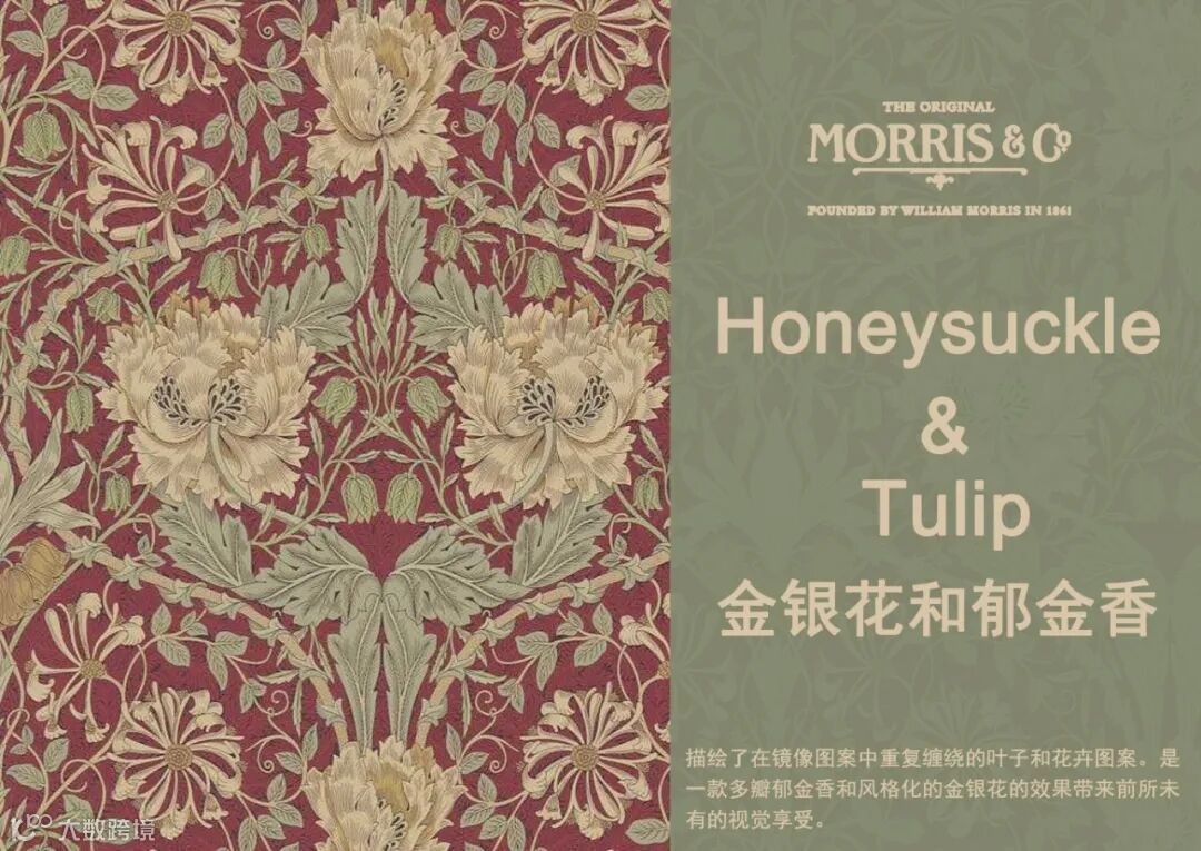 金银花和郁金香图案于1876年首次生产,是莫里斯早期的织物设计,描绘了在镜像图案中重复缠绕的叶子和花卉图案。是一个格子圈大的多瓣郁金香和风格化的金银花的效果。这种美丽的对称设计有多种配色,包括全新的靛蓝&百里香色调。