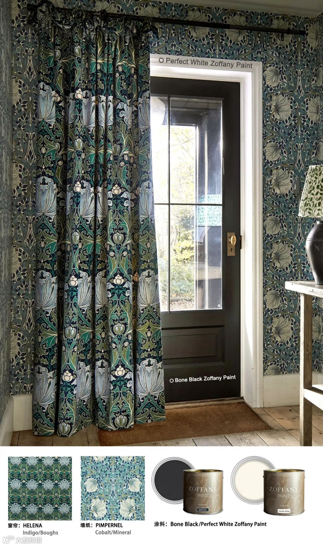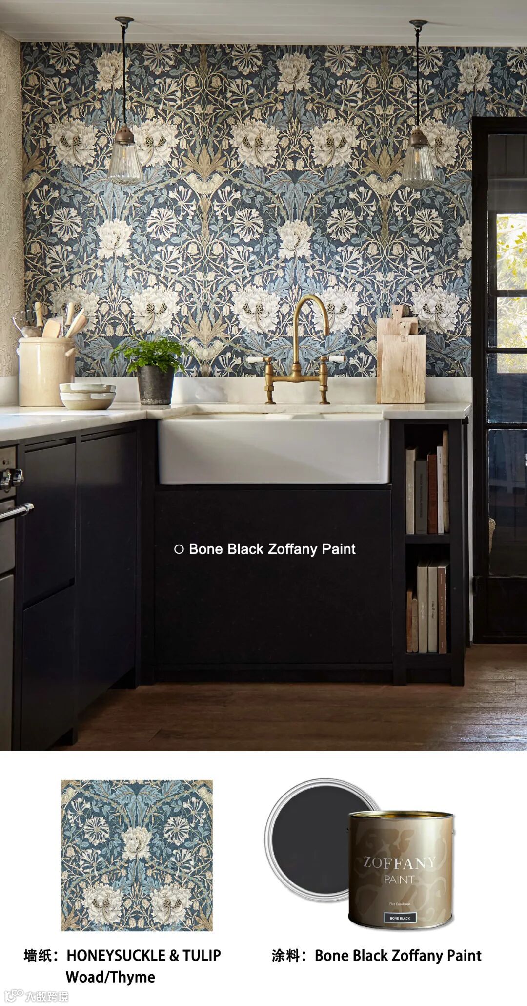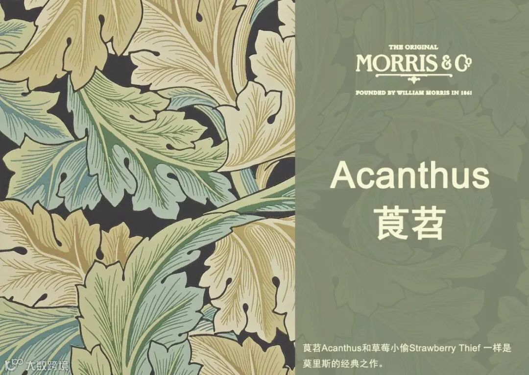 金银花和郁金香图案于1876年首次生产,是莫里斯早期的织物设计,描绘了在镜像图案中重复缠绕的叶子和花卉图案。是一个格子圈大的多瓣郁金香和风格化的金银花的效果。这种美丽的对称设计有多种配色,包括全新的靛蓝&百里香色调。
